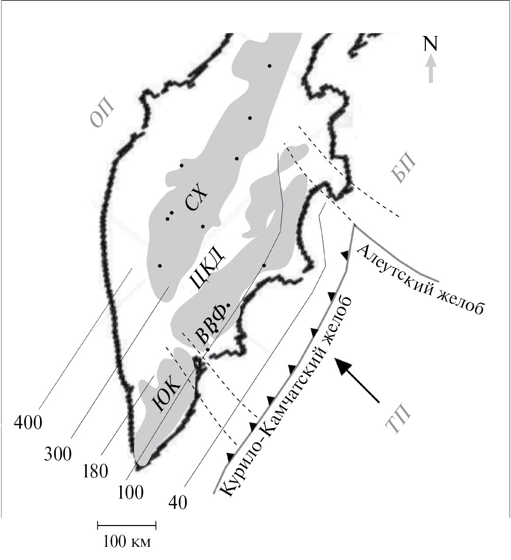 Рис. 1. Схема полуострова Камчатка. ОП, ТП, БП – литосферные плиты Охотская, Тихоокеанская, Берингийская, СХ – Срединный хребет Камчатки, ЦКД – Центрально-Камчатская депрессия, ВВФ – Восточный вулканический фронт, ЮК – Южная Камчатка. Серыми полями обозначены неоген-четвертичные вулканические пояса Камчатки. Точками обозначено расположение вулканических центров, данные по которым использованы в работе. Пунктирные линии ограничивают Малко-Петропавловскую (на юге) и Берингийскую (на севере) разломные зоны [Авдейко и др., 2006]. Сплошные тонкие линии – показатели глубины поверхности погружающейся плиты, по [Gorbatov et al., 2001].