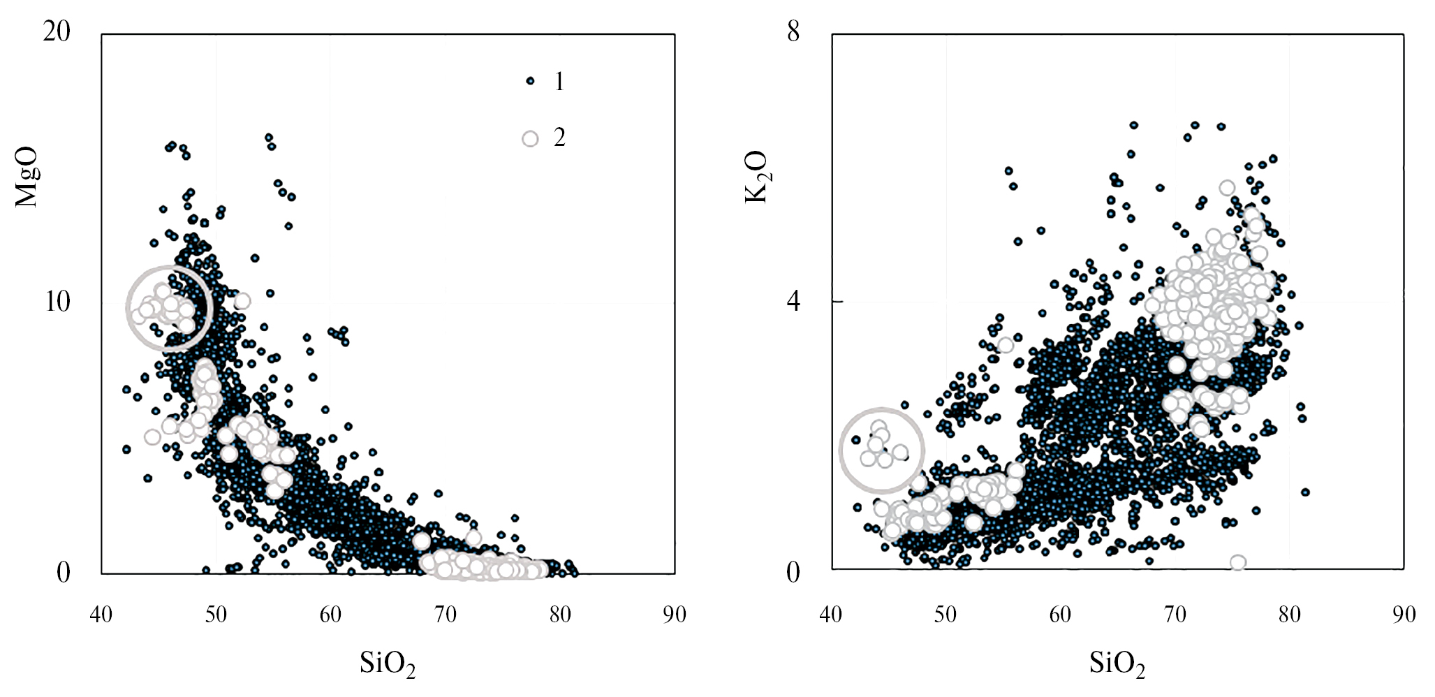 Несмотря на меньший охват объектов и меньшее количество анализов, в базе данных по составам расплавов Камчатки наиболее равномерно представлены расплавы разной кремнекислотности от пикробазальтов до риодацитов.