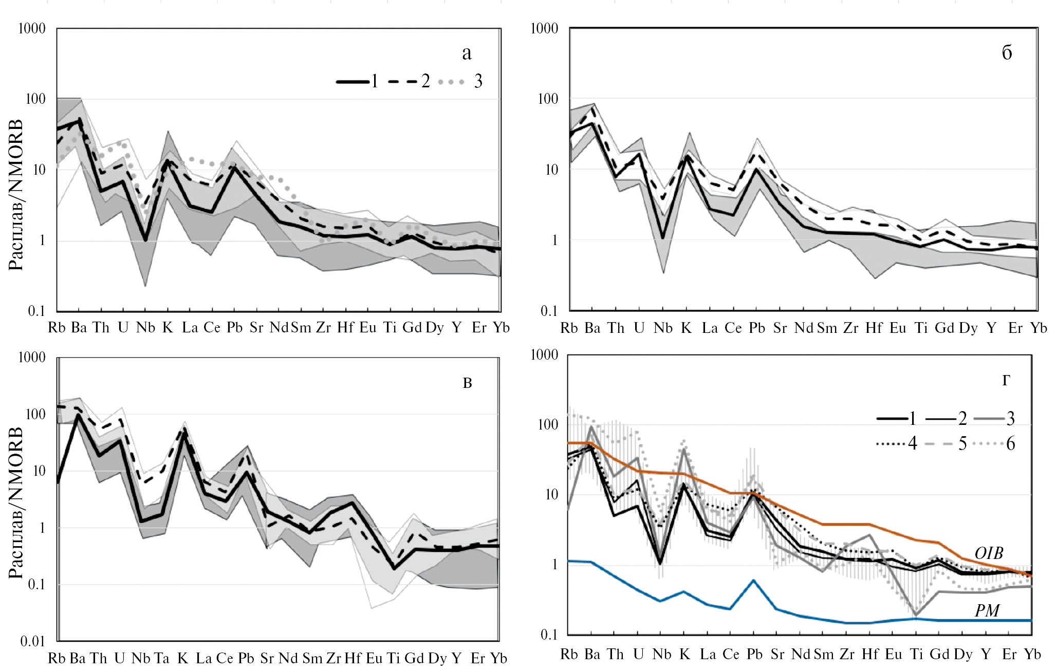 Специфика расплавов СХ и их относительная обогащенность некогерентными элементами объясняется, вероятно, множественностью петрогенетических факторов, среди которых неоднородность литосферной мантии, разные варианты генезиса флюида, а также возможное участие в магмогенерации астеносферной мантии и коры.