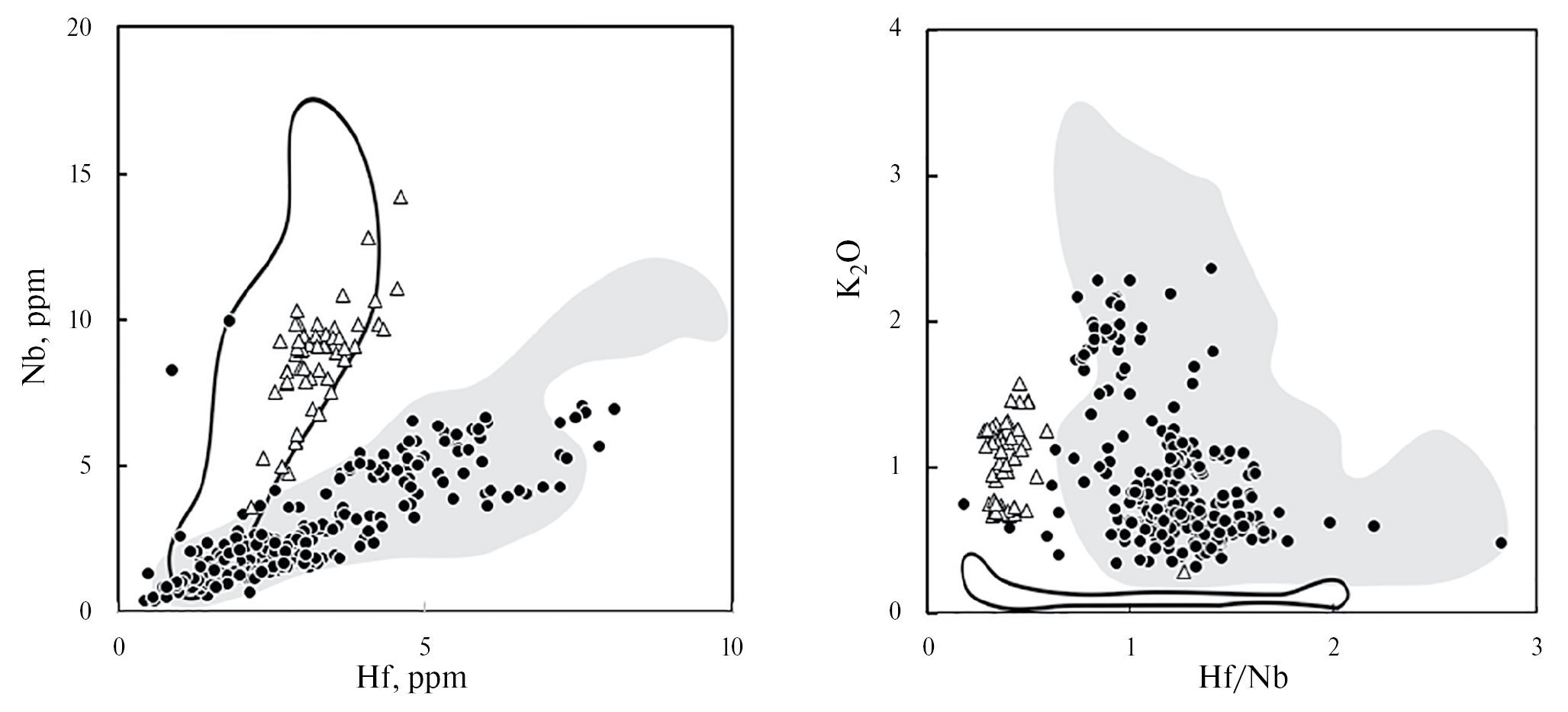 Рис. 7. Бинарные диаграммы Hf–Nb и Hf/Nb–K2O для основных и средних расплавов молодых вулканов ВВП и СХ. Маркеры расплавов ВВП и СХ те же, что и ранее. Полями отмечены расплавы офиолитов Камчатского мыса (пустое поле) и вулканов Южной Камчатки (серое поле) (см. [Наумов и др., 2020] и ссылки в этой работе).