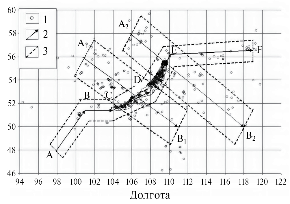 2. Fig. 1. Location of heat flow measurement stations in the Baikal rift zone, adjacent regions and profiling zones. 1 – heat flow measurement points; 2 – profiling directions; 3 – boundaries of profiling intervals.