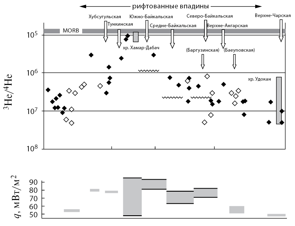 4. Fig. 3. Distribution of the values of the 3He/4He ratio (top) and the heat flux density (bottom) along the stretch of the Baikal rift zone [Polyak, 1988]. The black diamonds show the values of the isotope-helium ratio in the gases of hydrotherms lying near the axis of the rift zone, open – in adjacent areas (for example, in the Barguzin and Baunt depressions). The data on rocks are shown in shaded columns according to the ranges of values of the isotope-helium ratio indicated in [Polyak, 1988]. Wavy lines show the levels of the 3He/4He ratio in gases dissolved in lake water. Baikal.