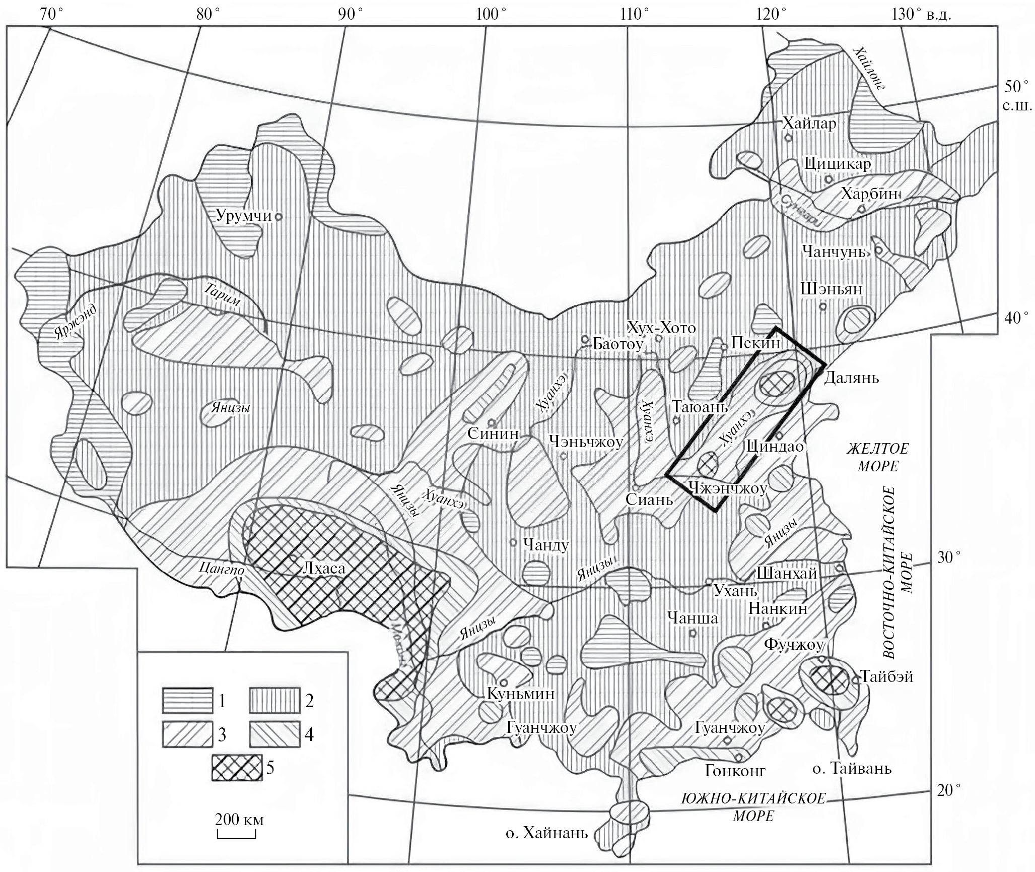 5. Fig. 4. Modern geothermal activity of the lithosphere of mainland China (according to [Lysak, 2009] with changes). 1-5 – geothermal activity (MW/m2): 1 – weak (<40); 2 – moderate (40-60); 3 – increased (60-80); 4 – high (80-100); 5 – very high (>100). The frame shows the Shanxi–Liaohe continental rift zone.