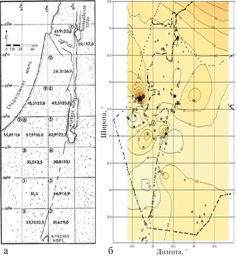 6. Fig. 5. Regional heat flow in Israel. The a–map is constructed by averaging measurements over 0.5×0 squares.5 [Eckstein, 1982]; b – heat flow map in isolines (MW/m2). The circles show the localization of the measuring points (the diameter of the circles is proportional to the value of the heat flow).