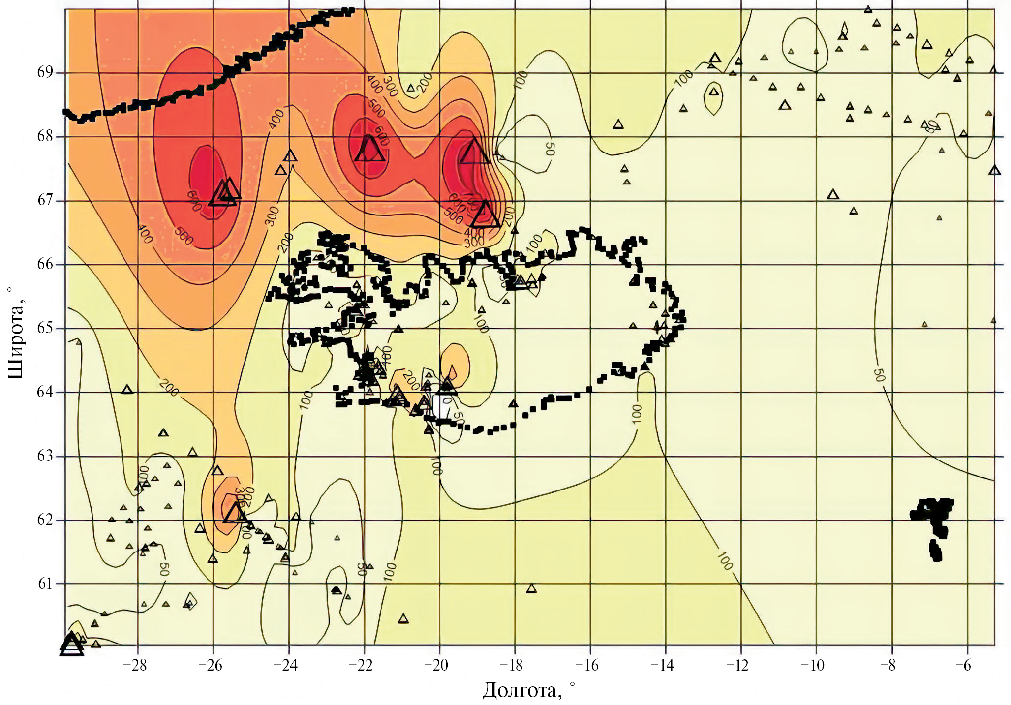 7. Fig. 6. Map of the heat flow of Iceland and adjacent water areas (isolines – in MW/m2). Triangles are the points of measurement of heat flow. Their size is proportional to the amount of heat flow.