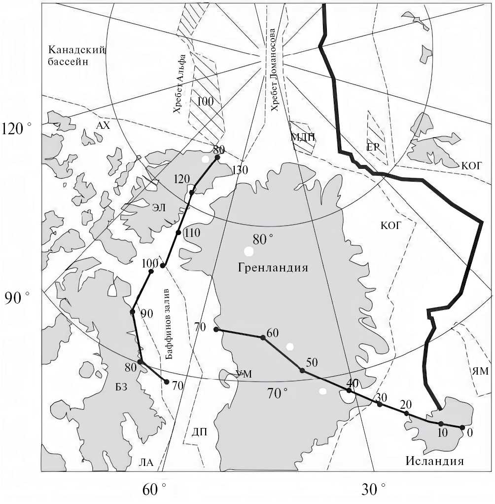 8. Fig. 7. The track of the North American plate in the Greenland region over the Icelandic “hot spot” for a time from 130 Ma to 0 Ma. Large black dots – paleoposition of the plate for every 10 million years; AH – Axel Helberg Island; BZ – Baffin Land; DP – Davis Strait; EL – Ellesmere Island; YAM – Jan-Mayen; KA – Kangerlusak lava plateau, East Greenland; KO – Kolbeinsey ridge; LA Labrador Sea; TIR – the Morris-Jessop plateau; ME – the Mendeleev Ridge; RE – the Reykjavik Ridge; UM – the lava plateau of the Umanak Fjord, Western Greenland; ER – the Ermak plateau; KOG – the boundary of the continental and oceanic crust according to bathymetry. The white circles show the position of the plume according to [Forsyth et al., 1986].