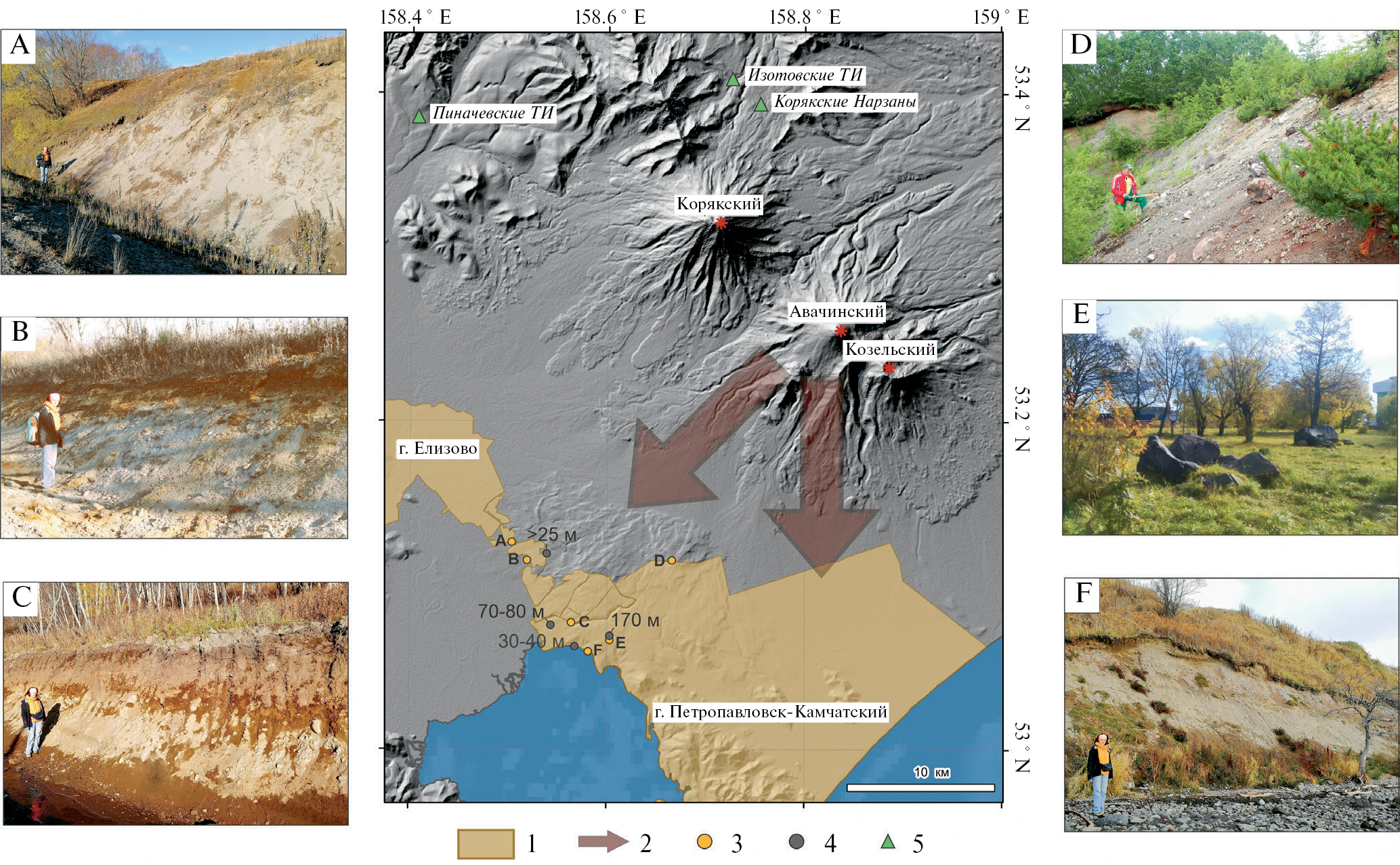 Рис. 3. Направления распространения обвально-взрывных отложений от плейстоценовых извержений Авачинского вулкана и фото представительных обнажений. Фото авторов. 1 – территории населенных пунктов Елизовско-Петропавловской агломерации; 2 – направления распространения обвально-взрывных отложений от позднеплейстоценовых катастрофических извержений Авачинского вулкана (по [Мелекесцев и др., 1991]); 3 – места съемки обнажений: A – поселок (п.) Красный, B – п. Нагорный, C – п. Крутобереговый, D – гора Лагерная, E – парк у здания ИВиС ДВО РАН, F – бухта Моховая; 4 – точки измерения мощности отложений обломочных лавин (по [Гриб и др., 1985; Мелекесцев и др., 1991]); 5 – термальные источники (ТИ).