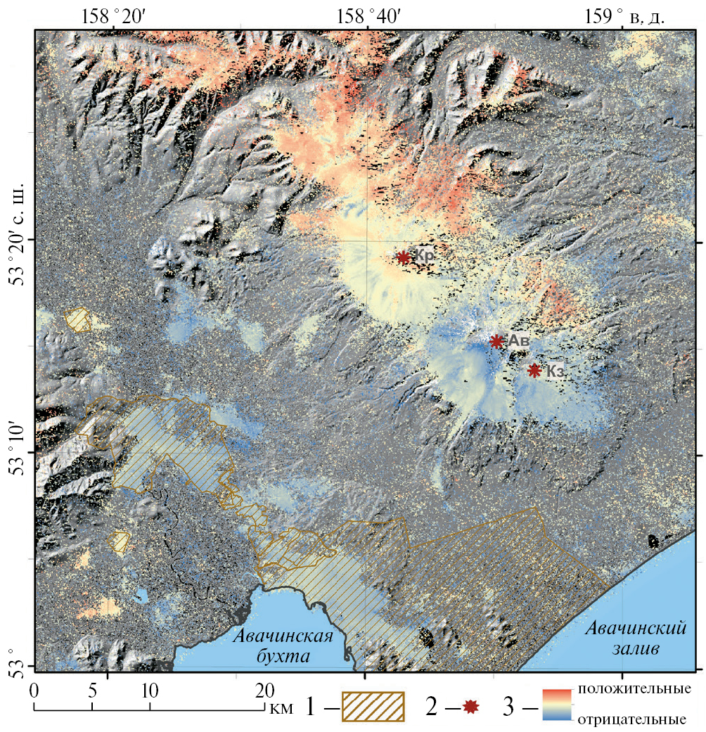 Рис. 4. Относительные деформации земной поверхности, полученные методом SBAS по InSAR-данным. Положительные деформации интерпретируются как поднятия, отрицательные — как опускания. 1 – территории населенных пунктов Елизовско-Петропавловской агломерации; 2 – вулканы: Кр – Корякский, Ав – Авачинский, Кз – Козельский; 3 – относительные деформации.