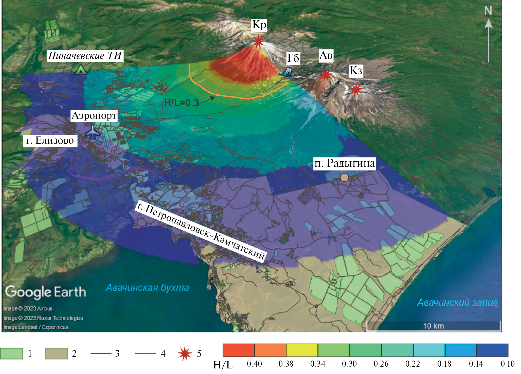 Рис. 7. Карта опасности от потенциальных обломочных лавин на вулкане Корякский. На 3D-сцену наложены области распределения параметра H/L, приведенные на рис. 6а и 6б. 1 – области землепользования (пастбища, фермы, садоводческие товарищества и др.); 2 – территории населенных пунктов; 3 – дороги, проезды; 4 – линии электропередач; 5 – вулканы: Кр – Корякский, Ав – Авачинский, Кз – Козельский. ГБ – горнолыжная база, ТИ – термальные источники. 1–4 – по данным проекта OpenStreetMap [2022].