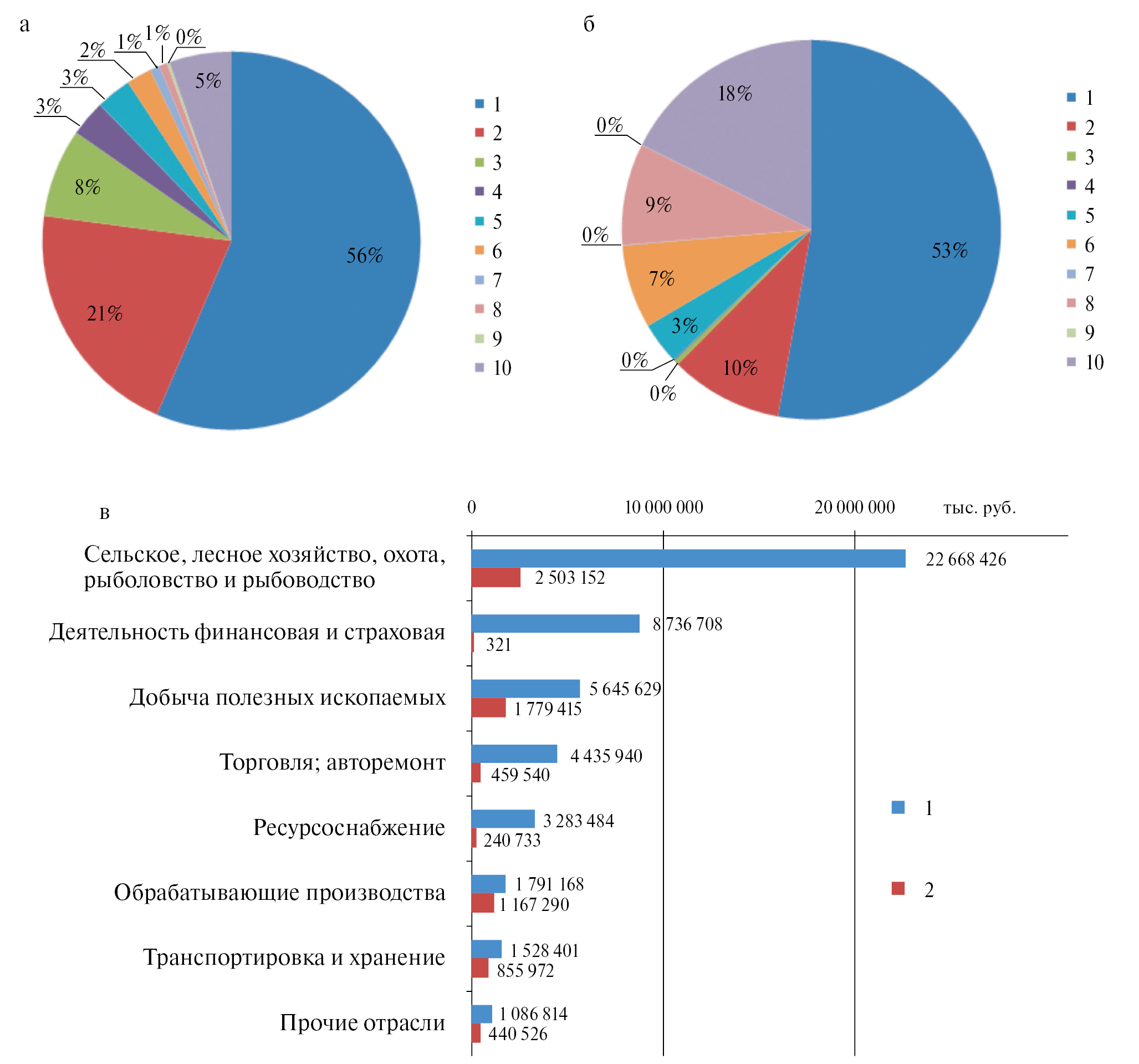 Рис. 8. Социальные и экономические показатели районов Камчатского края, по [База ..., 2023]. а – процентное распределение населения на 01.01.2023; б – процентное распределение прибыли организаций по данным бухгалтерского учета за 2021 г.; в – распределение прибыли организаций г. Петропавловска-Камчатского и Елизовского района в различных отраслях за 2021 г. 1 – Петропавловск-Камчатский городской округ; 2 – Елизовский муниципальный район (МР); 3 – Вилючинск; 4 – Мильковский МР; 5 – Усть-Камчатский МР; 6 – Усть-Большерецкий МР; 7 – Быстринский МР; 8 – Соболевский МР; 9 – Алеутский муниципальный округ; 10 – Корякский округ.