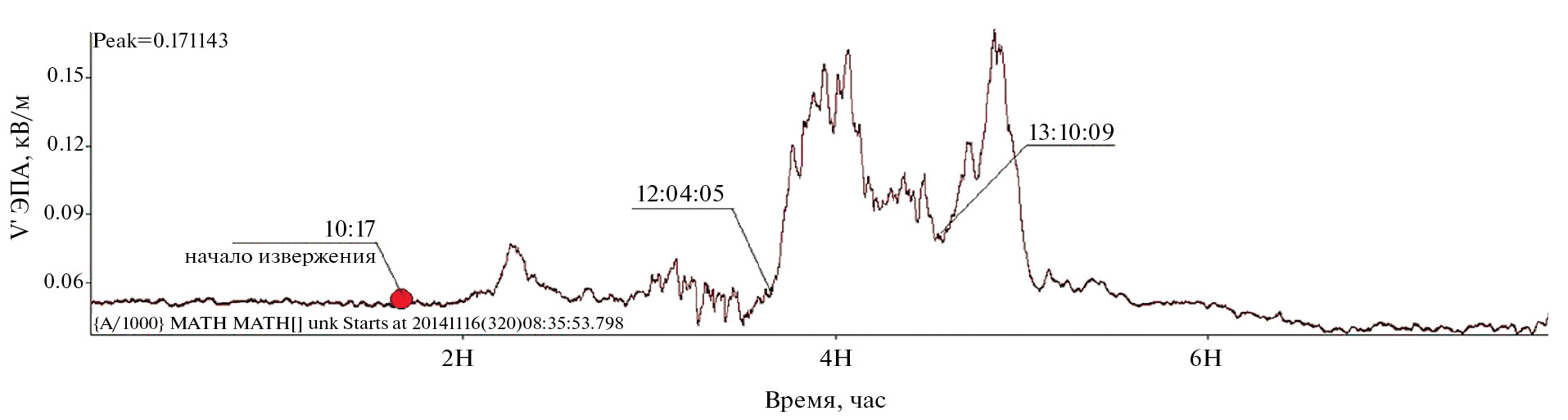 4. Fig. 3. Fragments of the recording of the gradient of the electric field potential in KZY during the spread of the eruptive cloud from the eruption of Shiveluch on 16.11.2014.