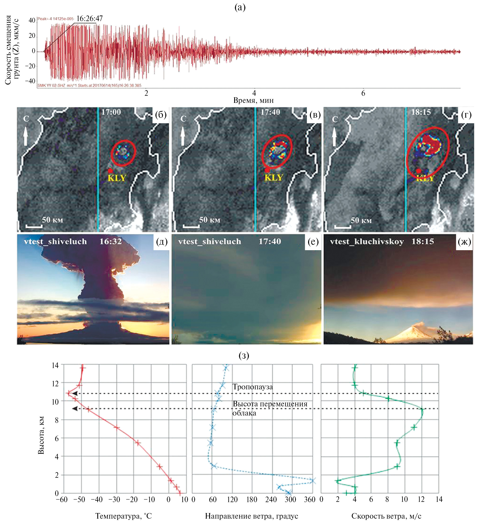 а – вертикальная компонента скорости смещения грунта сейсмического сигнала на SMK, сопровождавшего эксплозивное землетрясение 14.06.2017 г. в. Шивелуч; б, в, г – распространение эруптивного облака от извержения в. Шивелуч 14.06.2017 г.: в 16:26 по данным спутниковых снимков HIMAWARI-8 (http://rammb.cira.colostate.edu); д, е, ж – развитие эруптивного облака, зафиксированное видеокамерой в KLY; з – температурная и ветровая стратификации атмосферы по данным баллонного зондирования в KLY.