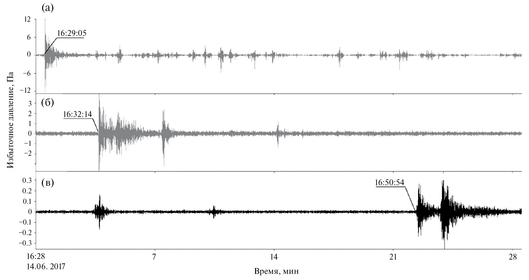 Рис. 5. Запись воздушной волны, сопровождавшей извержение 14.06.2017 г., на акустических станциях (а – KLY; б – KZY; в – IS44).