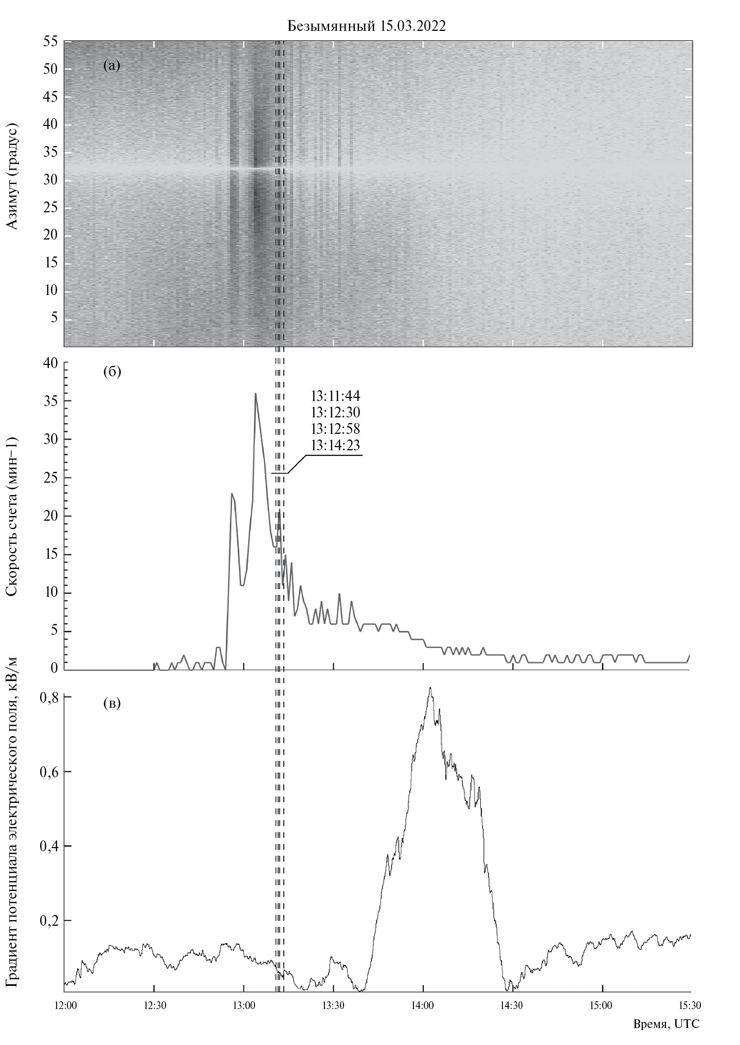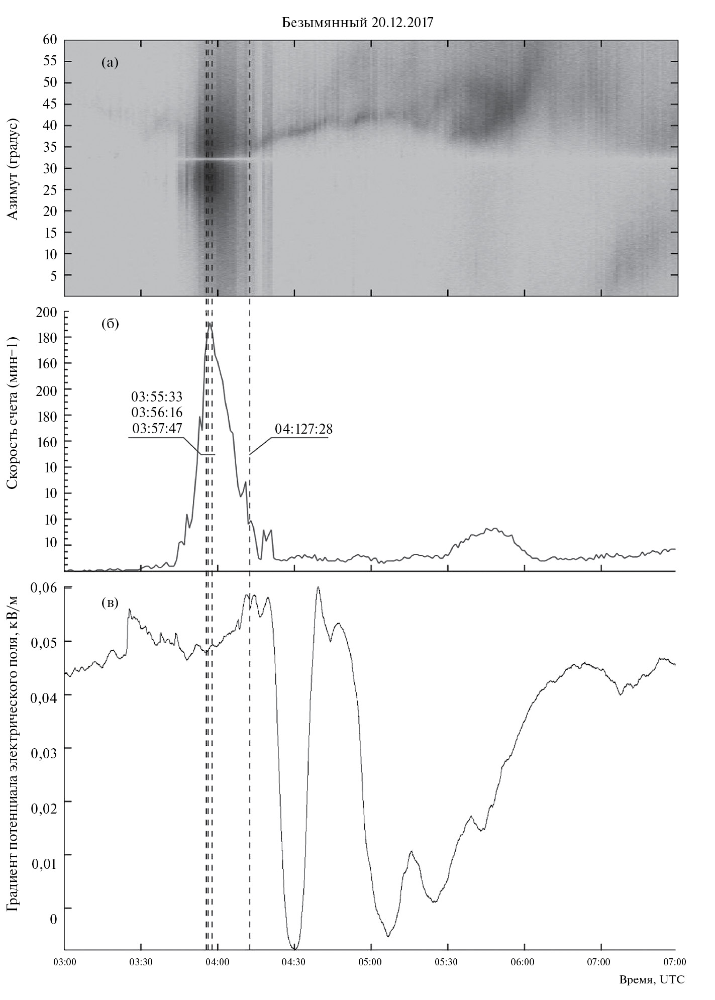 а – азимут прихода ИЭИ; б – скорость счета ИЭИ в минутных интервалах; в – фрагменты записи градиента потенциала электрического поля атмосферы в KLY. Пунктирной линией показаны моменты разрядов молний, зарегистрированные сетью WWLLN.