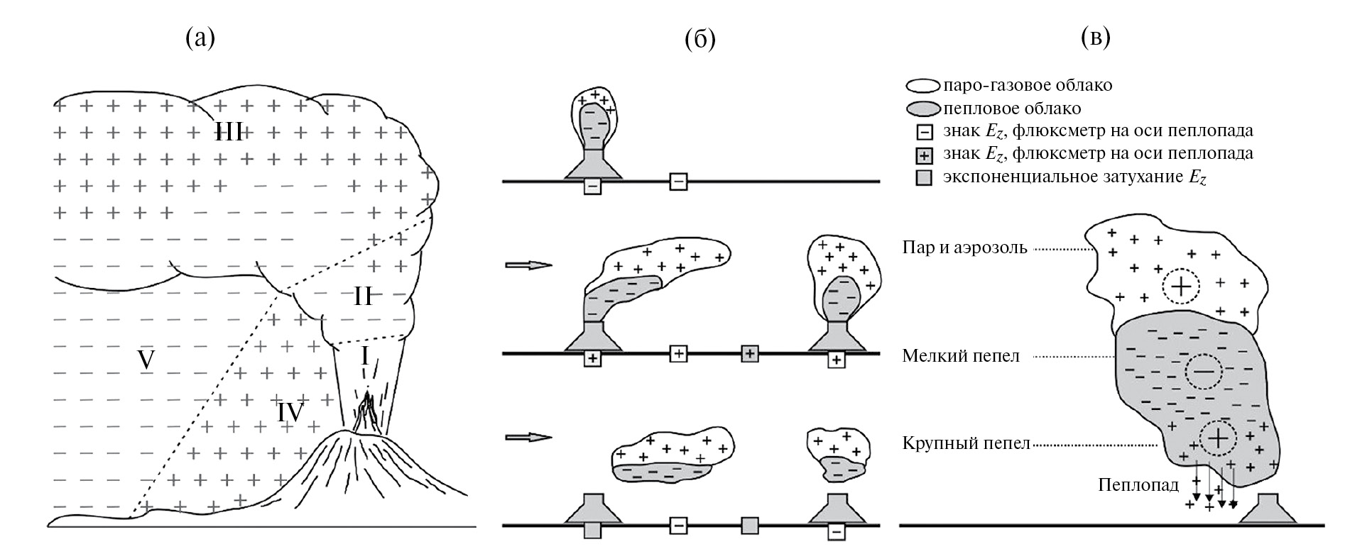 На основании результатов натурных наблюдений градиента потенциала электрического поля атмосферы (V΄ ЭПА) на вулкане Сакурадзима (Япония) во время его извержения в 1991 г. [Lane, Gilbert, 1992] и в 1995 г. [Miura et al., 2002], а также на Большом трещинном Толбачинском извержении (БТТИ) в июле–октябре 19٧5 г. (п-ов Камчатка, Россия) [Руленко, Токарев, 19٧9] были предложены феноменологические схемы разделения объемных зарядов во время формировании эруптивной колоны и при распространении эруптивного облака (рис. 11).