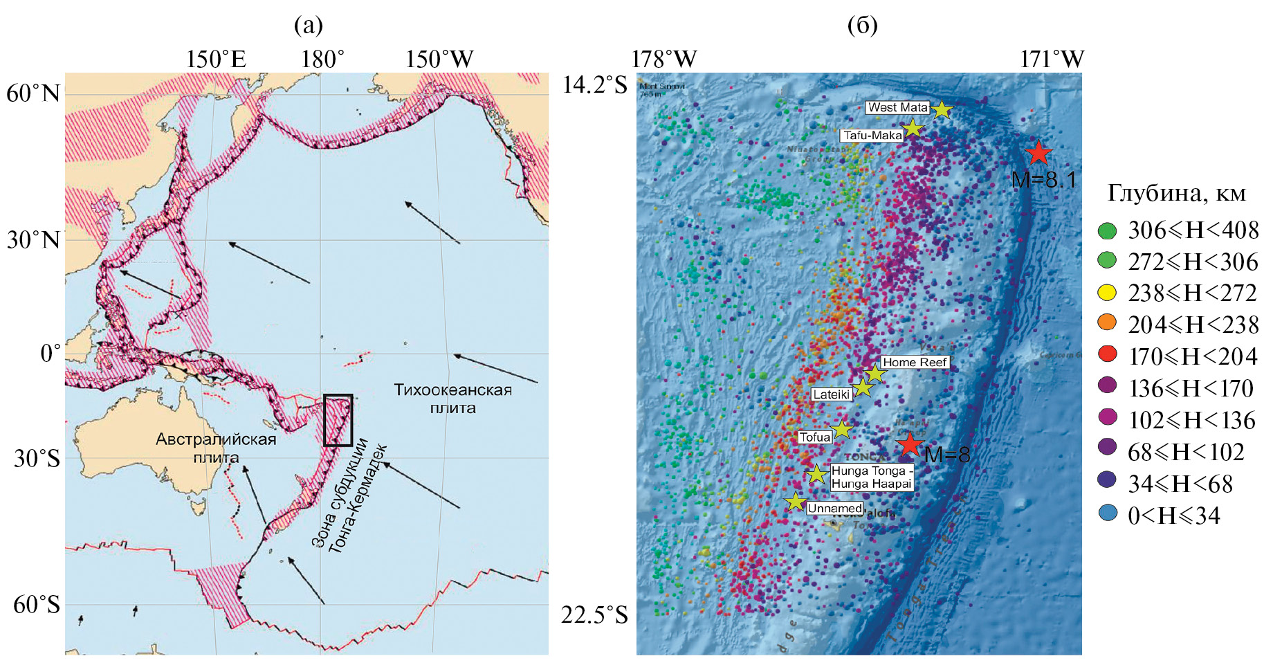 Зона субдукции Тонга–Кермадек является частью протяженной границы Австралийско-Тихоокеанской плиты и простирается примерно на 2٧00 км между Новой Зеландией и южной частью Самоа (рис. 1а). Тонга–Кермадек – самая глубокая впадина в южном полушарии, сейсмичность здесь выражена от поверхности до глубины ~720 км [Bonnardot et al., 2007]. Эта зона субдукции обеспечивает конвергенцию между Тихоокеанской и Австралийской плитами и является местом самых высоких скоростей субдукции Тихоокеанской плиты и ее доминирующего растяжения [Bevis et al., 1995; Bonnardot et al., 2009]. Скорость конвергенции составляет около 15–16 см/год [Kusky, 2022], увеличиваясь к северу до максимума ~24 см/год [Bevis et al., 1995]. Регион характеризуется высокой активностью как поверхностных, так и глубоких землетрясений (см. рис. 1б) [Penisoni et al., 2021]. Северный край зоны субдукции Тонга–Кермадек (зона Тонга) характеризуется разрывом Тихоокеанской плиты, которая постепенно прогибается по мере того, как входит в северную часть желоба [Bonnardot et al., 2007]. В 2006 и 2009 гг. в этом регионе произошло два сильнейших землетрясения с магнитудами Mw = = 8.0 и 8.1 (см. рис. 1б).