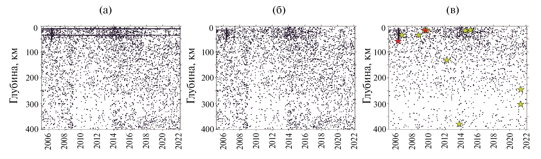 а – выборка из каталога USGS; б – распределение землетрясений после удаления решений гипоцентров с H = 10 и 35 км; в – распределение землетрясений с ограничением по магнитуде mb ≥4.5. Красными звездочками отмечены землетрясения с магнитудами mb = 8.2 и 8.3, желтыми – с 6.5 ≤ mb ≤ 6.9.