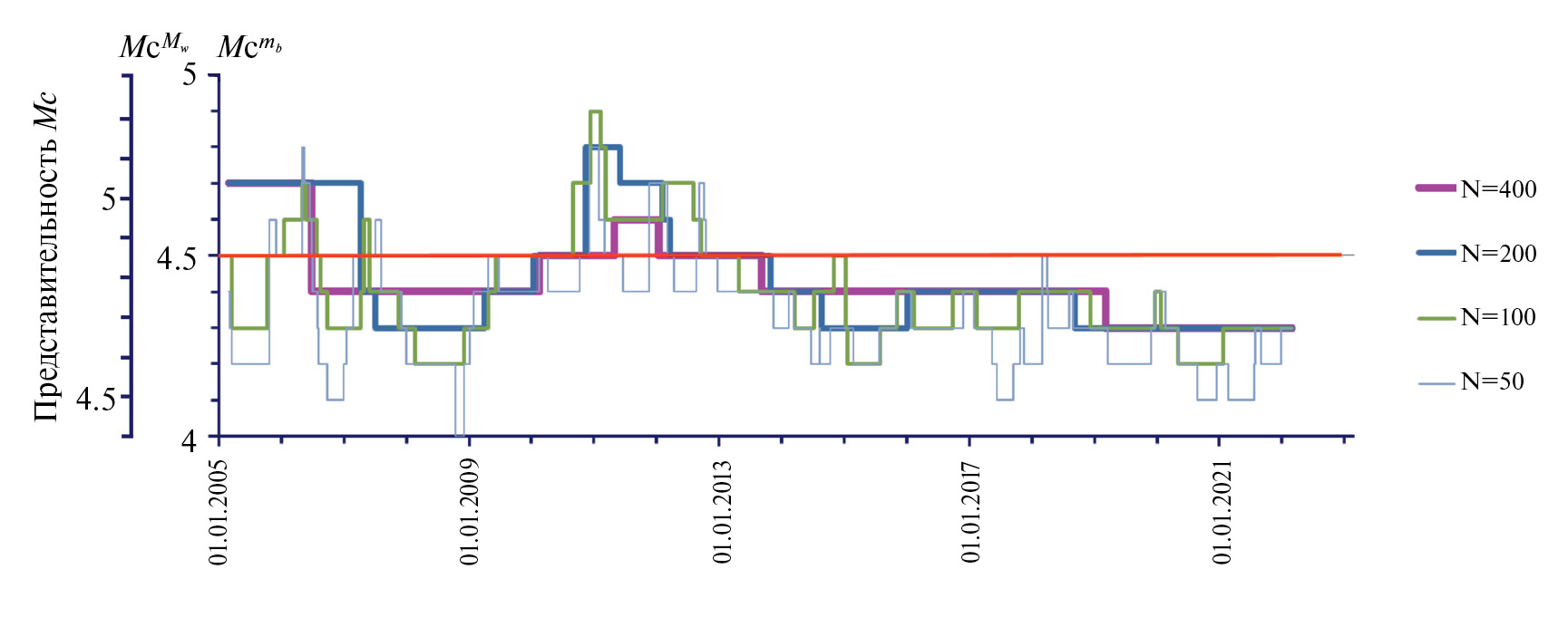 Представительная магнитуда для каталога, приведенного к магнитуде mb, оценивалась в скользящих окнах длиной от 400 до 50 представительных событий (рис. 3). Тенденции изменения совпадают для всех величин окон. Отметим, что применение меньших окон позволяет выявить короткие участки с лучшей представительностью, при этом статистическая значимость остается заданной. Оценка представительности каталога в целом дала значение =4.5 (красная линия, см. рис. 3), дополнительно здесь показана шкала представительности каталога, приведенного к магнитуде Mw. Для магнитуды Mw представительность каталога варьировалась от 4.4 до 5.2.