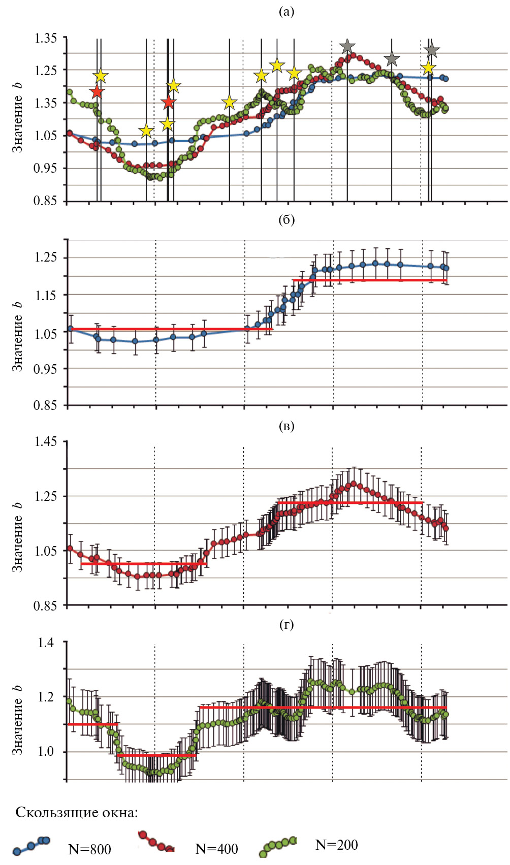 Рис. 5. Временной ход наклона графика повторяемости (здесь значение b ≡ bmb), рассчитанный в скользящих окнах шириной N = 800, 400, 200 землетрясений; вертикальные полосы – момент возникновения сильных землетрясений с mb ≥6.5 (а). Временной ход наклона графика повторяемости (значение b), рассчитанный в скользящих окнах разной ширины; вертикальные отрезки – стандартное отклонение значения b; красная горизонтальная линия – временной интервал, в пределах которого значение b постоянно (б–г).