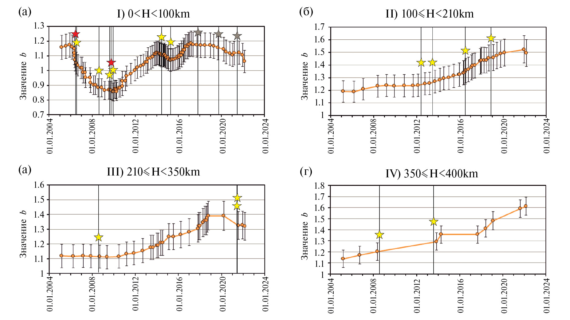 Для четырех диапазонов глубин (0–100 км, 100–210 км, 210–350 км, 350–400 км) (см. рис. 4) построен временной ход наклона графика повторяемости (рис. 6). Для поверхностного слоя (см. рис. 6а) выделяется статистически значимое падение значения b(t) с 06.2005 по 12.2010 г. с 1.18 ± 0.1 до 0.88 ± 0.08. На этом участке графика наиболее сильные землетрясения попадают на понижение кривой b(t) и вблизи минимумов b(t): два сильнейших землетрясения 3 мая 2006 г. с mb = 8.2, H = 55 км и 29 сентября 2009 г. с mb = 8.3, H = 18 км, а также четыре землетрясения с mb = 6.6–6.9 (см. табл. 1). Поверхностные землетрясения в 2014 и 2015 гг. произошли на участке графика, где ошибка σb была значительной для определения трендов b. Дополнительно на график вариации значений b для диапазона глубин 0–100 км (см. рис. 6а) нанесены упомянутые выше три землетрясения с mb = 6.5–6.8 с присвоенной глубиной H = 10 км (серые звездочки), исключенные из расчетного каталога (см. табл. 1). В связи с тем, что мы не знаем их истинную глубину, вариации значений b на этом участке графика не обсуждаются.