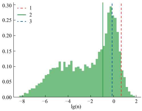 1 – положение половины высоты правой ветви распределения минимальных значений функции близости (0.7); 2 – предварительное значение η0 = 10(–0.94); 3 – положение правой моды (–0.12).