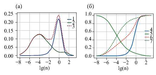 а — взвешенные плотности распределений: 1 – распределение kprandom(η), 2 – распределение (1–k)pclustered(η), 3 – распределение preal(η); б ‒ функции распределения: 4 – функция Frandom(η), 5 – функция 1-Fclustered(η), 6 – функция Freal(η), 7 – функция Fclustered(η).