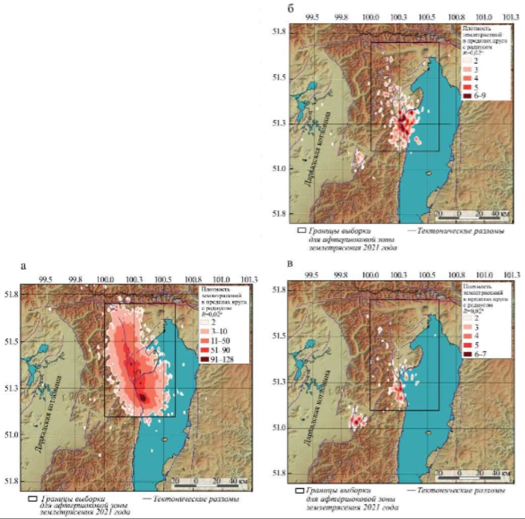 Рис. 1. Карты плотности землетрясений в эпицентральной области Хубсугульского землетрясения за 2021, 2022 и 2023 гг. (а, б и в соответственно). Не отображены площадки с одним землетрясением.