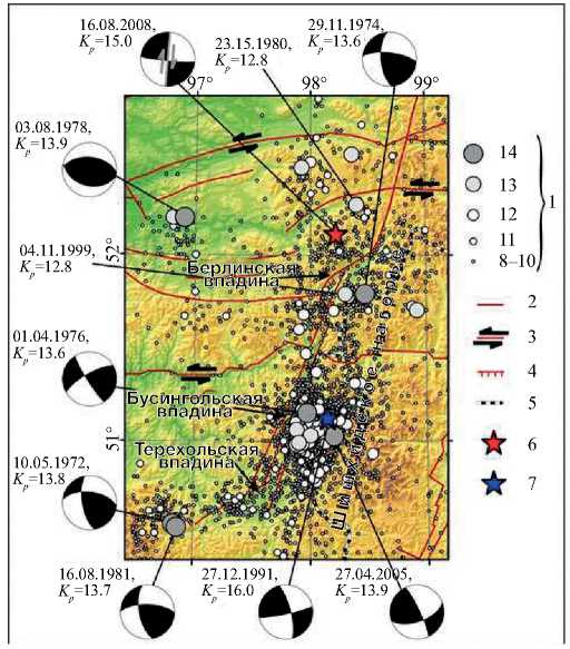 1 – энергетический класс КР; 2 – разлом (по ГИН РАН, под ред. Ю.Г. Леонова); 3 – сдвиги (по [Кочетков и др., 1993]); 4 – сбросы (по [Парфеевец, Саньков, 2006]); 5 – государственная граница; 6 – эпицентр Белин-Бий-Хемского землетрясения 2008 г.; 7 – эпицентр Бусингольского землетрясения 1991 г.