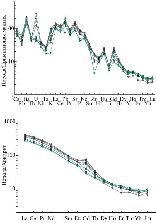 Концентрации элементов нормированы к примитивной мантии, по [Sun, McDonough, 1989], РЗЭ – к хондриту, по [Sun, McDonough, 1989].