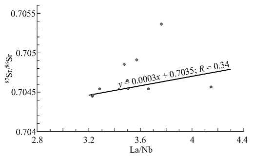 С другой стороны, при условии отсутствия масштабного загрязнения коровым материалом, относительно высокие изотопные отношения Sr (0.7045–0.7054) и Pb (для 206Pb/204Pb от 18.861 до 18.944, для 207Pb/204Pb от 15.611 до 15.643 и для 208Pb/204Pb от 38.898 до 38.979) и относительно низкие для Nd (+2.1…+3.0 в единицах εNd) в изученных породах, в совокупности с сильными аномалиями LILE по отношению к соседним элементам группы LREE и LREE относительно HFSE (см. рис. 1), чаще всего свидетельствуют о наличии субдукционно модифицированного мантийного источника (скорее всего EM II типа), участвовавшего в генезисе материнских расплавов щелочных базальтоидов. Анализ La–Nb систематики пород приводит к похожему заключению.