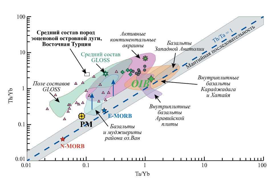 Поля составов пород GLOSS ‒ [Plank, 2014], активных континентальных окраин ‒ [Pearce, 1983]. Поля составов внутриплитных базальтов Аравийской плиты ‒ [Shaw et al., 2003; Krienitz et al., 2006, 2007; Lustrino, Wilson, 2007], района оз. Ван (Восточная Анатолия) ‒ [Oyan et al., 2017] и областей Караджадаг и Хатай (Турция) ‒ [Parlak et al., 2000; Bagcı et al., 2011; Lustrino et al., 2012; Keskin и др., 2012]. Средний состав пород эоценовой островной дуги, Восточная Турция ‒ [Neill et al., 2013]. Средние составы резервуаров E-MORB, N-MORB, OIB, PM, UC и GLOSS — [Sun, McDonough, 1989; Тейлор, Мак-Леннан, 1988; Plank, 2014].