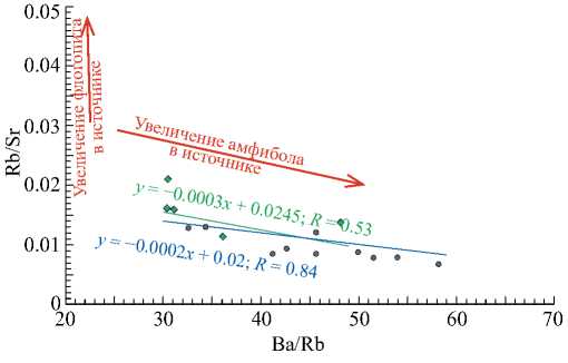 Известно, что в мантийных источниках обогащенных субдукционной компонентой обычно присутствует амфибол (Amp) или/и флогопит (Phl) [Furman, Graham, 1999; Allen et al., 2013; Oyan et al., 2017 и др.]. Коэффициенты распределения Rb и Ba для Phl гораздо выше, чем для Amp [LaTourette et al., 1995; Furman, Graham, 1999 и др.], что позволяет использовать эти несовместимые элементы и их отношения при решении вопроса о присутствии либо отсутствии Amp и/или Phl в области мантийного источника [Allen et al., 2013; Oyan et al., 2017 и др.]. Щелочные базальтоиды Капанского центра обладают низкими значениями отношений Rb/Sr (0.007–0.021) и высокими Ba/Rb (30.4–58.2) и на диаграмме Ba/Rb–Rb/Sr (рис. 5) поле их составов вытянуто вдоль “амфиболового” тренда, что указывает на плавление Amp-содержащего мантийного источника. Важно отметить, что в большинстве случаев в исследованных породах наблюдается лишь невысокая корреляция между Ba/Rb и MgO (для базанитов R = 0.73, для орданшитов R = 0.56), а также между Ba/Rb и SiO2 (для базанитов R = 0.58, для орданшитов R = 0.30). Эти факты позволяют полагать, что за данные геохимические особенности, по меньшей мере орданшитов, вероятнее всего ответственен реститовый Amp обогащенного мантийного источника, а не его фракционирование в подводящих каналах и малоглубинных магматических камерах.