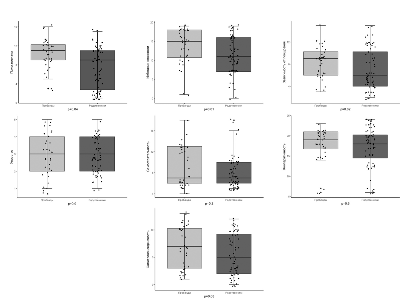 Оценка темперамента и характера в семейных случаях. Как видно из Рисунка, пробанды с расстройствами настроения, в сравнении с кровными родственниками, имели статистически значимо более высокие баллы TCI-125 по таким дименсиям, как поиск новизны (p=0.004), избегание опасности (p=0.01), зависимость от поощрения (p=0.02), а также самотрансцендентность на уровне тенденции к значимости (p=0.08).
