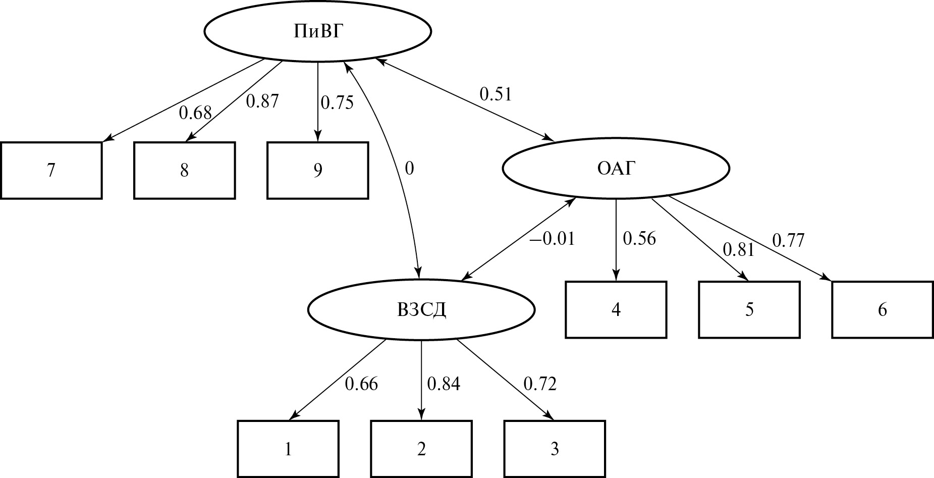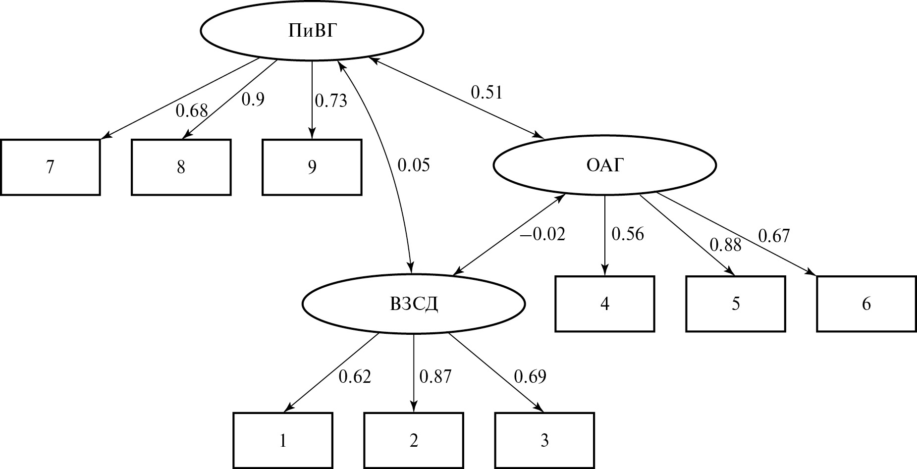 Рис. 1. Стандартизированные оценки параметров трехфакторной модели, полученные на выборке членов неформальных подгрупп