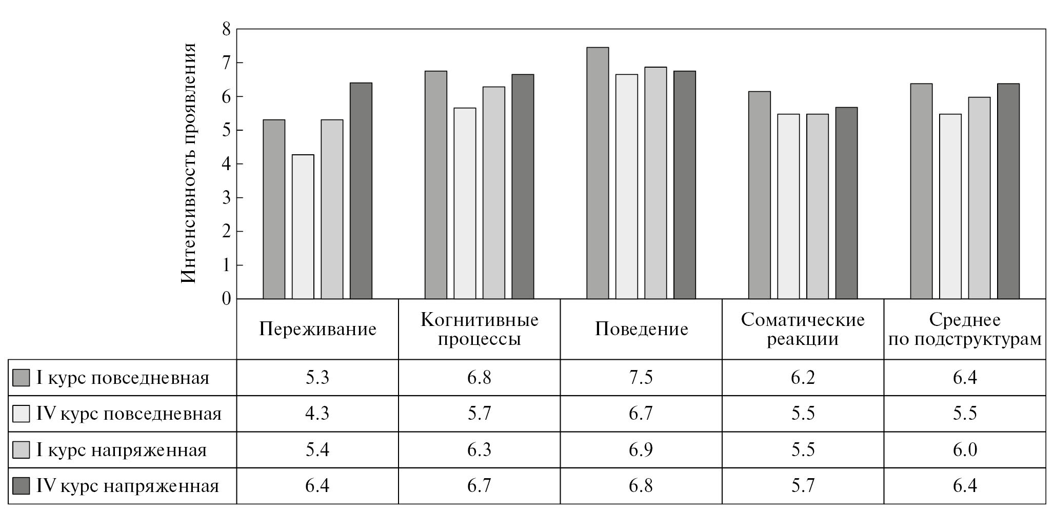 Рис. 1. Интенсивность проявления подструктур психических состояний студентов в повседневных и напряженных ситуациях на разных этапах обучения
