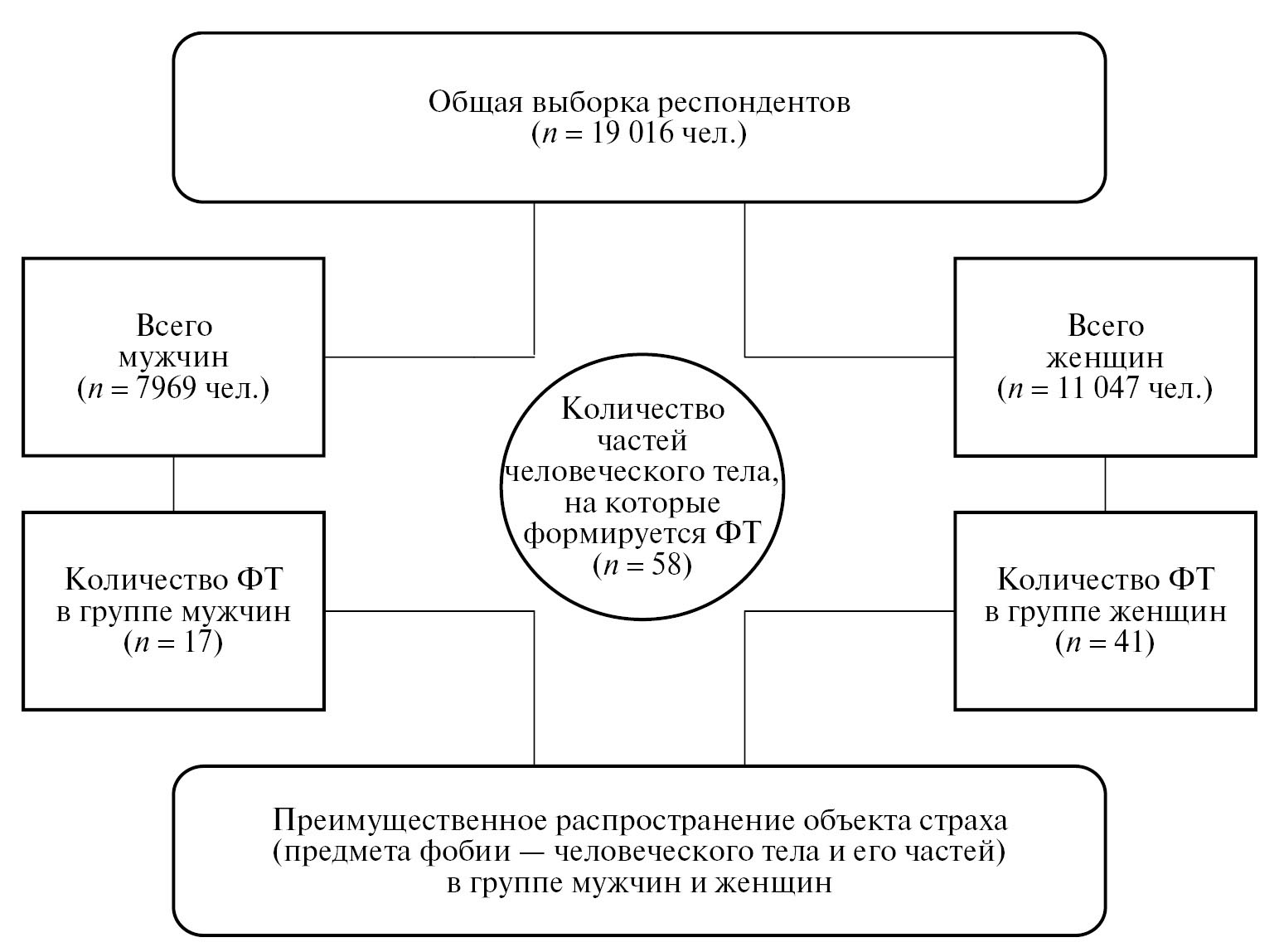 Представляется, что вышеизложенное подтверждает определенную целесообразность изучения фобий человеческого тела через призму половых/гендерных различий и позволяет актуализировать к данной проблеме научный интерес. При этом многочисленные данные подтверждают, что ФТР поражают около 21% женщин и 11% мужчин [5]. Кроме того, данное исследование носит пилотный характер и представляет собой движение в направлении верификации феномена ФТ в пределах ФТР, включающего в себя страх частей человеческого тела, в отношении которых формируются фобические расстройства.