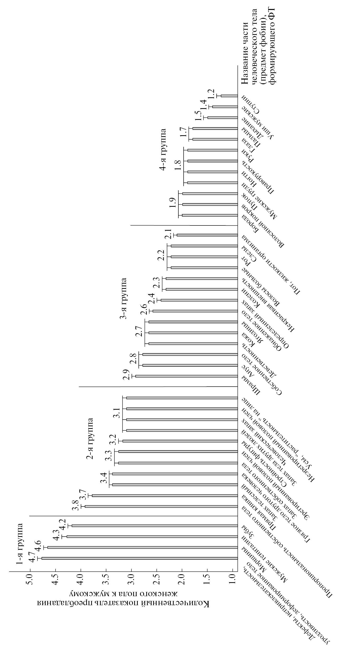 На рис. 3 гистограмма распространенности частей человеческого тела, формирующих ФТ у женщин, демонстрирует четыре разные по численному соотношению группы частей человеческого тела, вызывающих страх у женщин. Женщины чаще испытывают фобии от таких частей человеческого тела, как морщины на лице и теле, мужские гениталии и зубы, условно включенных нами в первую группу триггеров страха по количественному показателю соотношения мужского пола к женскому.