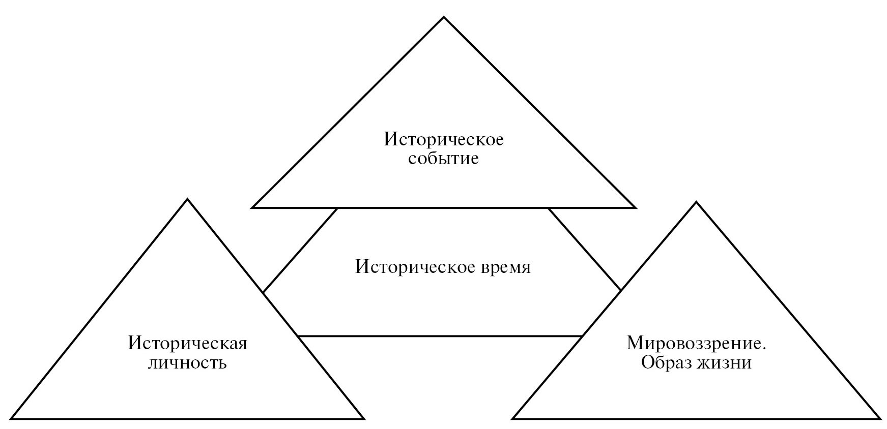 Таким образом, первичная категориальная триада для определения психологического понятия “историческое время” включает в себя, на наш взгляд, три основных компонента, которые являются существенными, необходимыми и достаточными для определения содержания конкретного исторического времени. К ним относятся: исторические события этого времени, исторические личности и сложившееся мировоззрение и образ жизни людей этого исторического периода. Разделить на отдельные компоненты образ жизни и мировоззрение, на наш взгляд, представляется невозможным ввиду их тесной взаимосвязи, взаимовлияния, что обеспечивает их сущностное единство (рис. 1).
