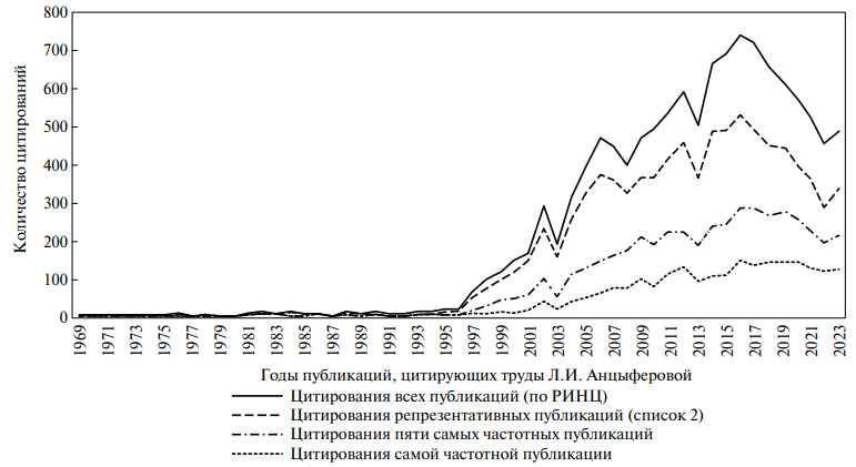 Обозначим факторы, которые могли повлиять на распределение цитирований во времени: с логико-научной точки зрения, повышалось научное признание идей Л.И. Анцыферовой в целом и ее последних достижений в частности; с личностной — коллеги и ученики активно обращались к ее трудам; с научно-организационной — после ее смерти отмечались памятные даты, была организована юбилейная конференция в 2019 г. [20]; с социально-исторической — на увеличение показателей влияло общее развитие баз данных и стимулирование публикационной активности в стране.