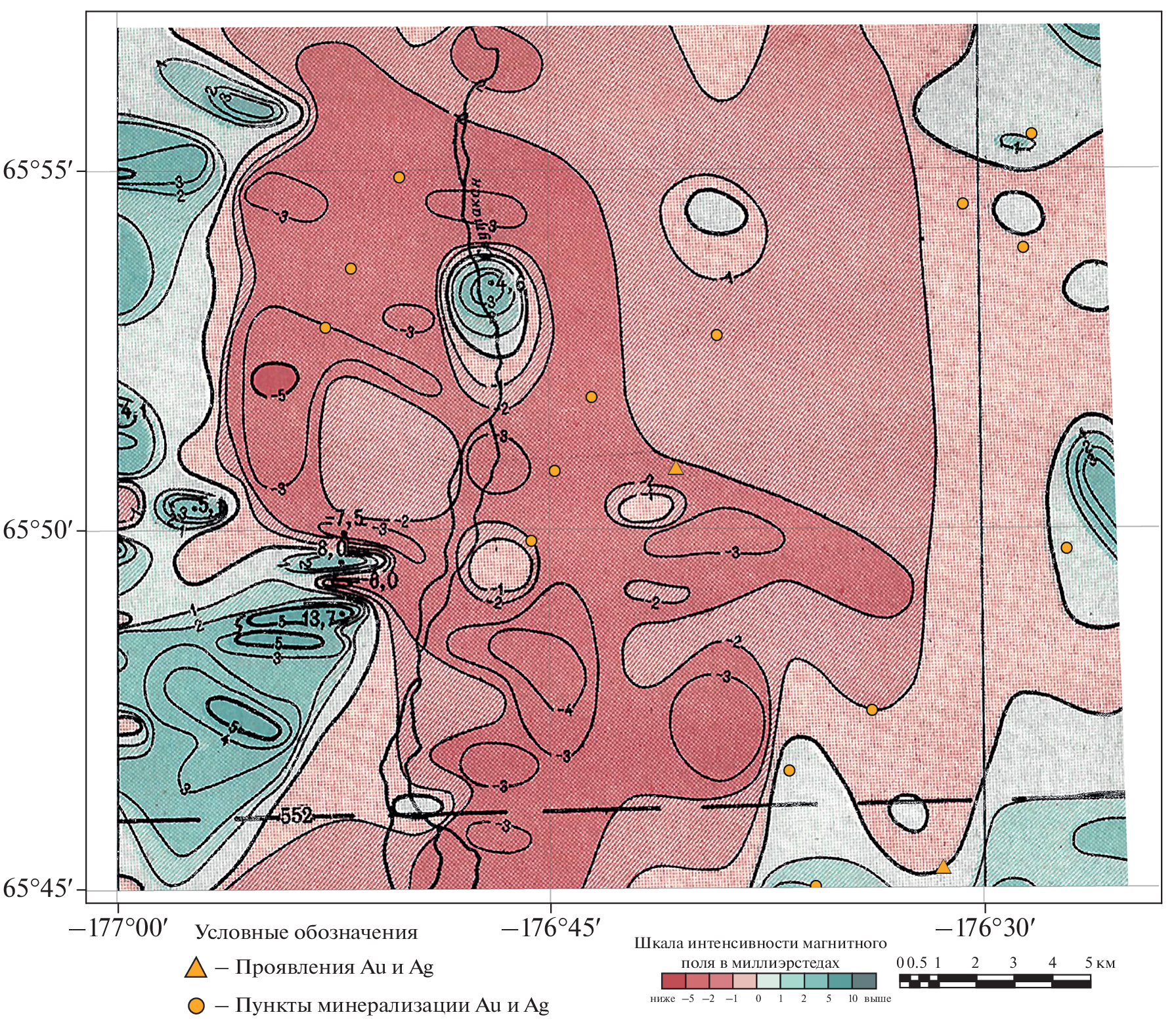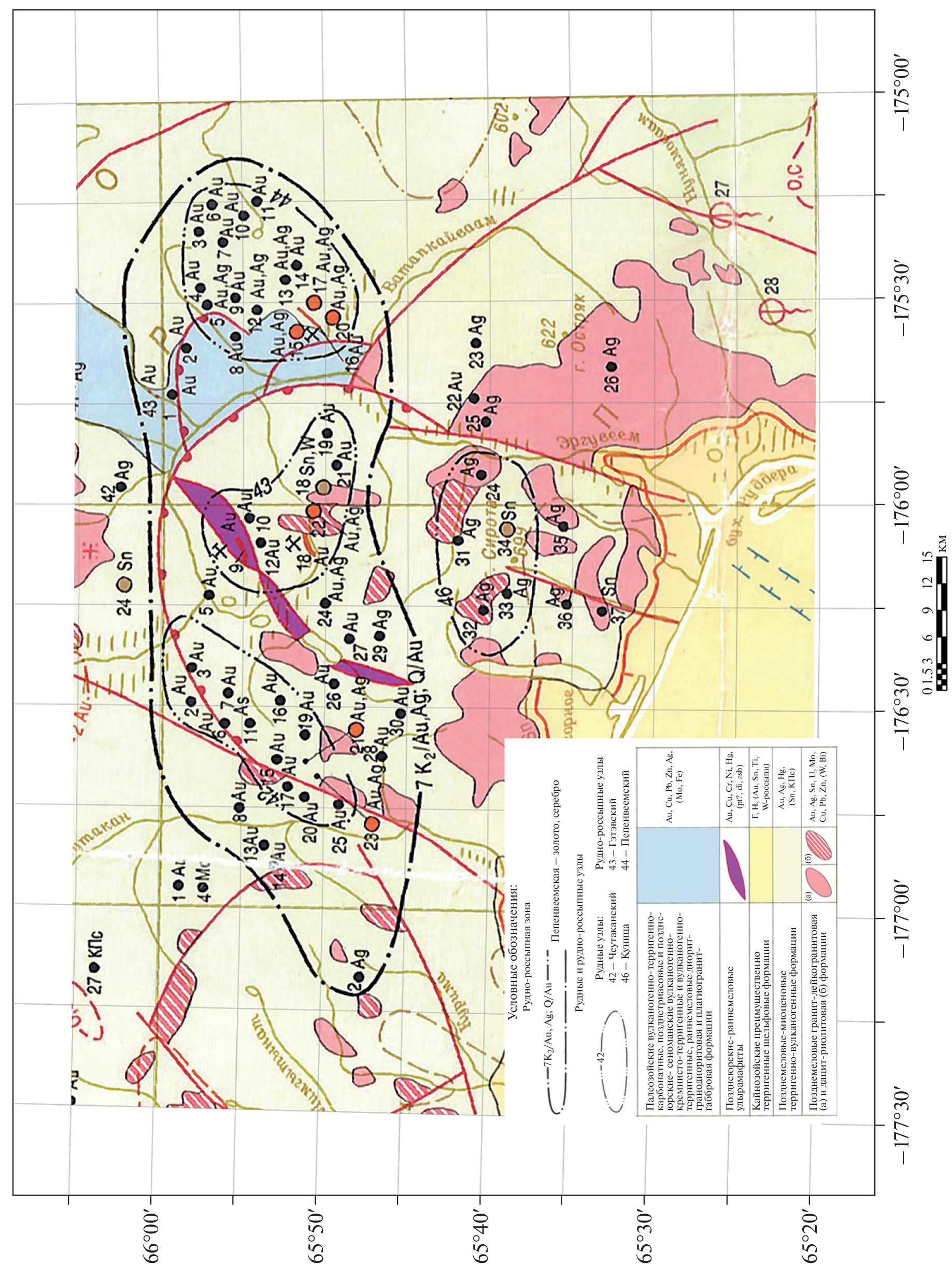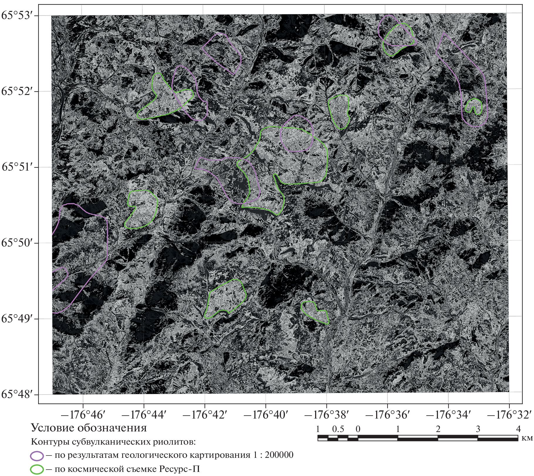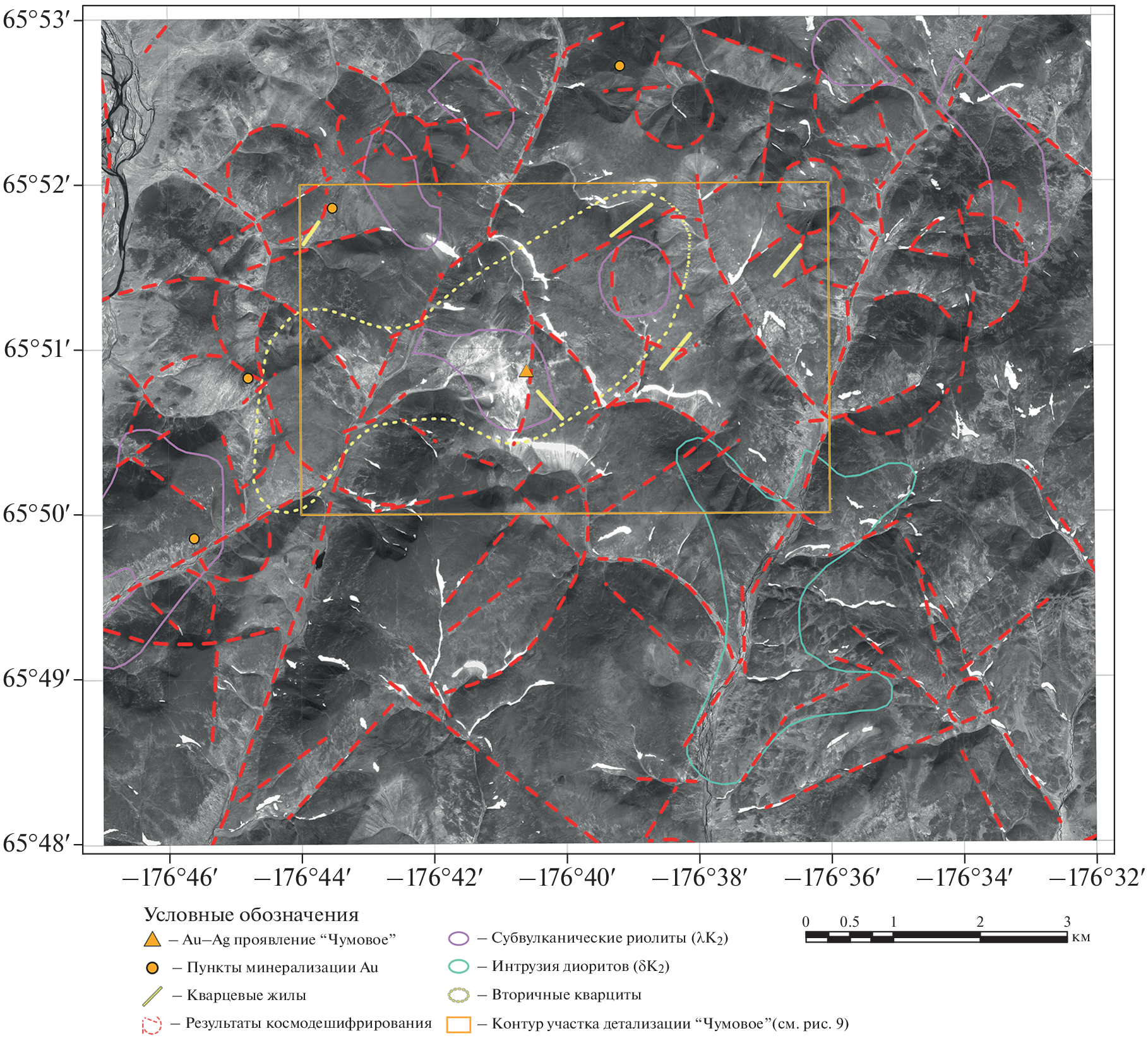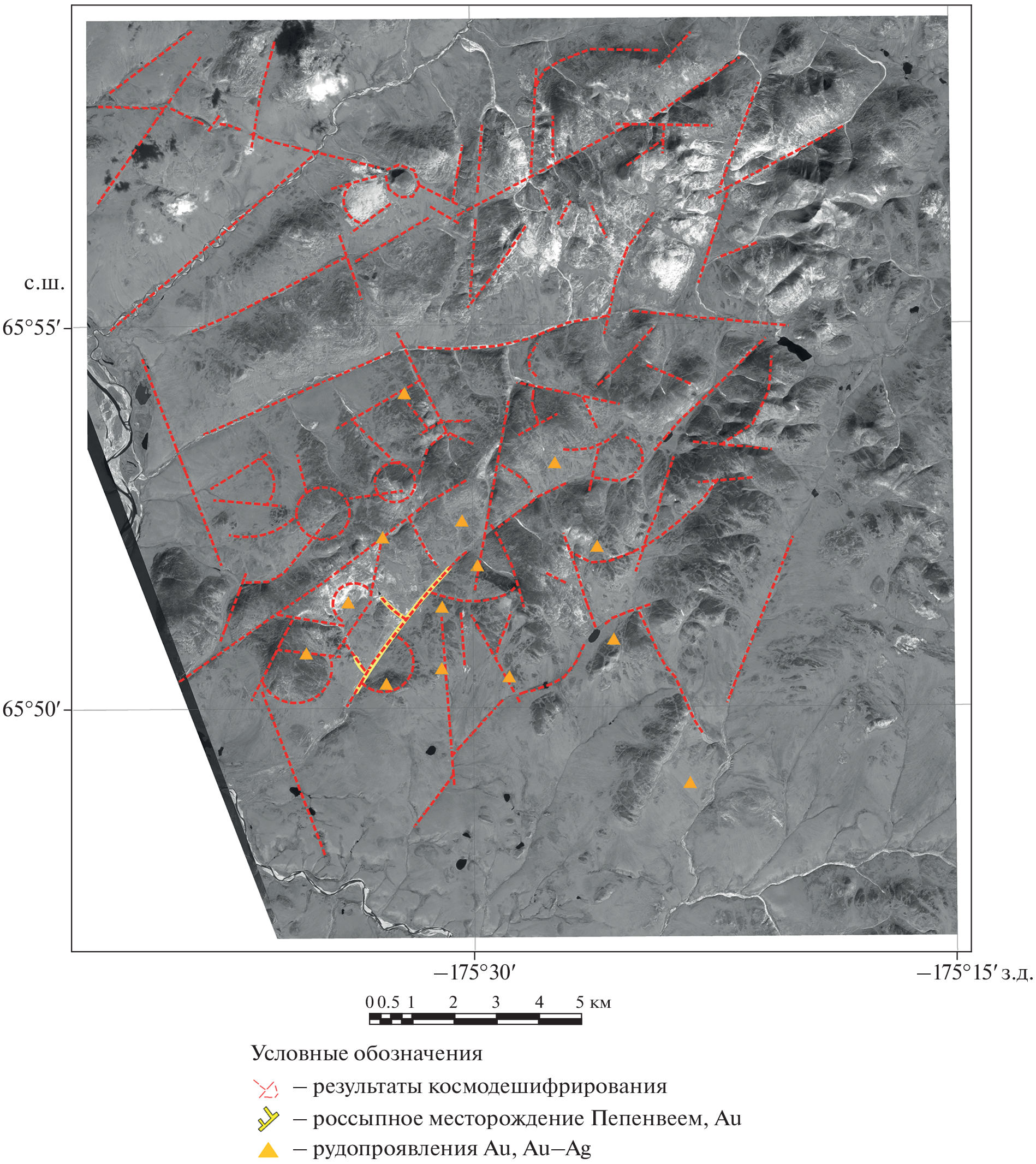 When deciphering the materials of space sensing of the eastern part of the Chukchi Peninsula on a scale of 1 : 50 000, structural elements of tectonic-volcanogenic genesis were revealed, represented by linear, arc, annular, zonal-concentric structural elements of various ranks. Ring structures with a diameter of up to 2 km and their dissecting disjunctiva mainly of the north-eastern and submeridional strike control the localization of gold mineralization of the Pepenveem ore-placer zone. On the basis of computer processing of the ASTER infrared satellite image in the Pepenveem zone, the areas of development of hydrothermally altered rocks (berezites, secondary quartzites, sericite-hydrosluidic-quartz metasomatites) genetically associated with mineralization were identified. The use of high-resolution satellite imagery in conjunction with geophysical data made it possible, on a scale of 1 : 10 000, to identify gold-prospective areas associated with volcanic dome structures, which are characterized by an increased density of lineaments and are associated with the formation of subvolcanic rhyolites.