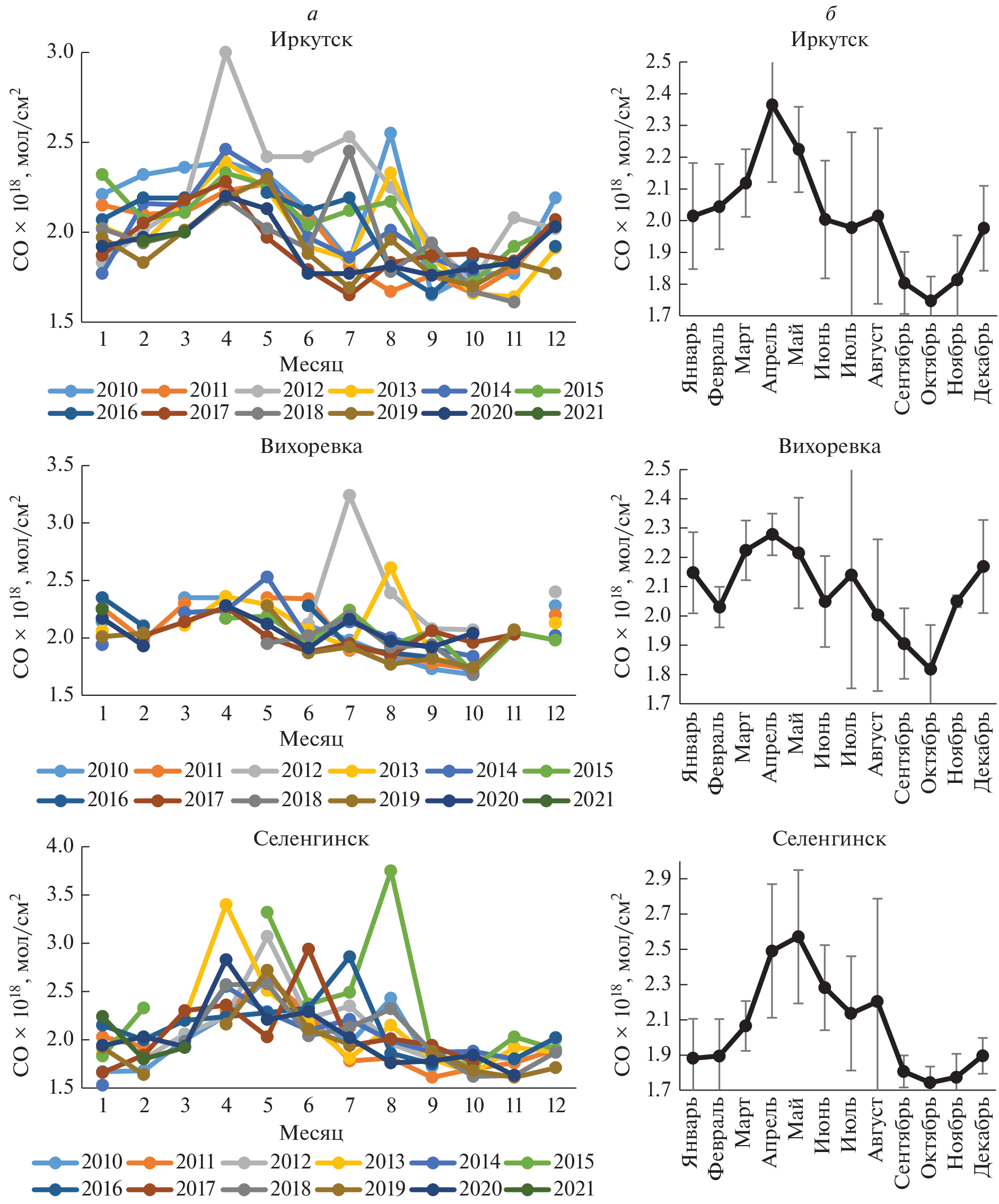Seasonal and interannual variations of the aerosol optical depth (AOD) and the total carbon monoxide content in the atmospheric column have been determined by measurements of the MODIS and MOPITT instruments of the Terra satellite for several cities of the Irkutsk region and Buryatia with high level of atmospheric pollution for the period 2010–2021. For Irkutsk, a decrease of AOD interannual value from 0.278 in 2012 to 0.14 in 2020 with a general negative trend is shown. However, in 2021, the interannual AOD value for Irkutsk increased to 0.22. For Irkutsk, a negative trend of interannual variations in the total CO content in the atmospheric column is shown. When comparing the long-term seasonal variations of AOD according to ground measurements by CIMEL photometer in Tory (Buryatia), and the OMI/Aura satellite data, it was shown the proximity of AOD values for the summer and autumn seasons and a significant excess of AOT according to satellite data over ground measurements for the spring months. The largest Spearman correlation coefficient between ground and satellite measurements of AOD belongs to 2021 and is equal to ρs = 0.64.