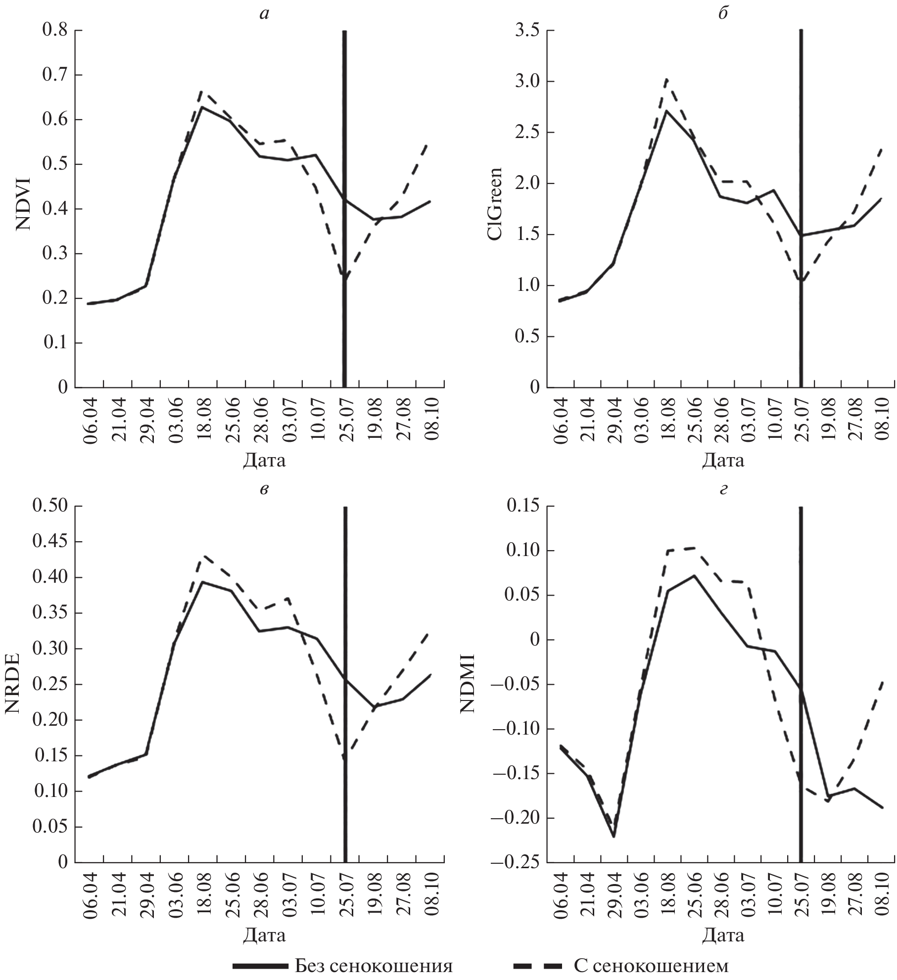 The study assessed the possibility of grassland monitoring based on various spectral vegetation indices (NDVI, ClGreen, NDRE, NDMI) calculated according to Sentinel-2 satellite data during the 2018 growing season. Geobotanical studies and collection of ground-based spectrophotometry data were carried out simultaneously, at the same time of day, and were used as an additional stage of haymaking monitoring. It was possible to identify grasslands and determine the date of mowing based on ground and satellite spectrometric data. A drop in the indices (NDVI, clGreen, NDRE, NDMI) was observed on the date of mowing (25.07.2018). The possibility of grassland interpretation based on the NDVI index was proven reliable. It was shown that the dates of mowing determined according to satellite data were in good agreement with the ground dates of mowing (July 25th and August 27th). The spatial distribution maps of the NDVI index of grasslands according to Sentinel-2 satellite data for certain dates (June 18th, July 10th, and August 27th) were drawn. The resulting maps make it possible to identify grasslands and mowing dates in large areas.