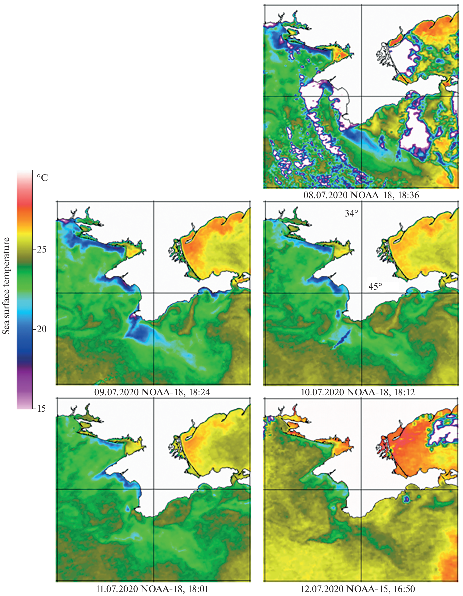 The paper presents the results of a study of upwelling in the Black Sea in three marine areas: in the northeastern part of the sea, near the Tendrovskaya Spit and the Western Crimea, and off the coast of Turkey. They are based on the use of multi-sensor remote sensing data, namely ocean color scanners (MODIS, VIIRS, OLCI-a and OLCI-b), infrared radiometers (TIRS and AVHRR), as well as synthetic aperture radar (SAR) images acquired by spaceborne SARs. An integrated approach using practically only remote sensing data makes it possible to quite fully characterize the observed upwellings in the sea. In the active phase, upwelling, in addition to sea surface temperature (SST), is usually displayed both in the phytoplankton chlorophyll-a concentration (chlor-a) and in the sea surface roughness on the SAR images. In the analyzed cases, the duration of upwellings varied from 6 to 10 days, the SST differences in the upwelling zone were up to 8°С, and the concentrations of chlor-a were 5–6 times higher than the background values of 0.5–0.7 mg/m3. The maximum SST anomalies, which are about 8°C, were observed off the Turkish coast. As a result of the analysis, a dynamic relationship was revealed between the areas of low SST in the upwelling zone (compared to the sea waters surrounding this zone), sea surface roughness and chlor-a concentration. It is shown that in the case of using the full set of available remote sensing data, the observation, monitoring and study of upwelling does not present any fundamental difficulties.