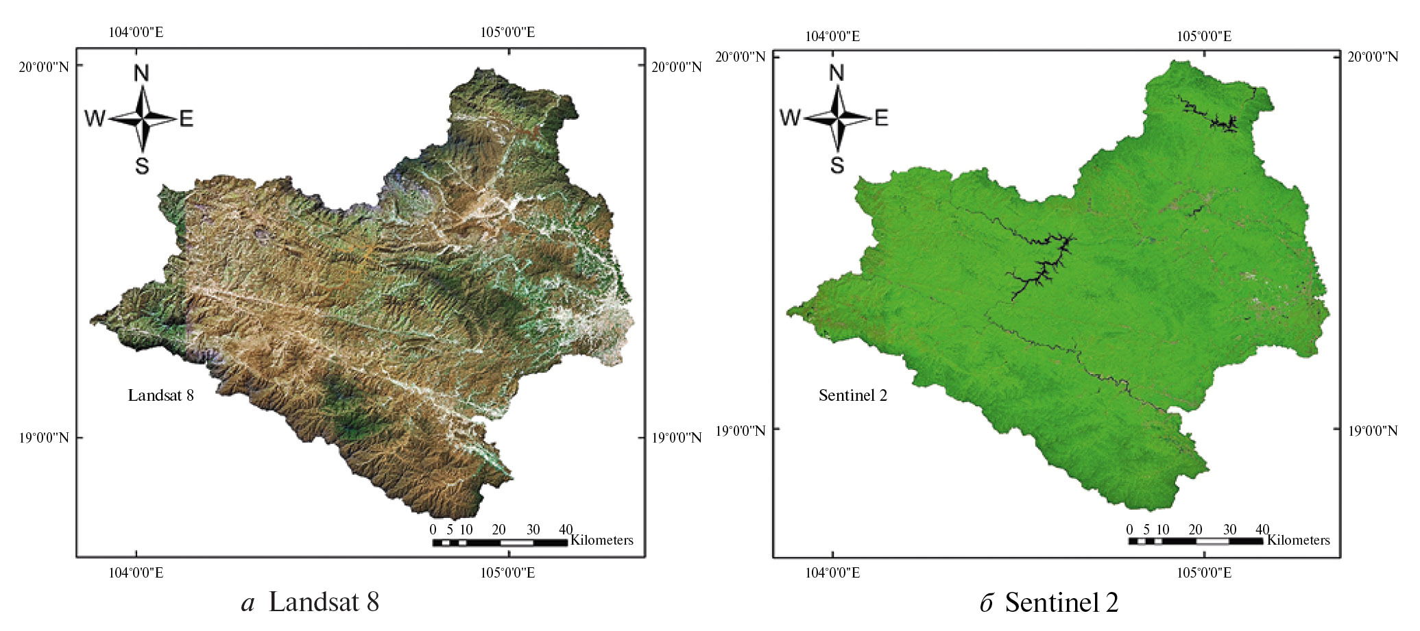 Для создания безоблачного изображения было отобрано 65 сцен Sentinel 2 MSI (Sentinel 2A и Sentinel 2B), сделанных за период с 15 ноября 2021 г. по 16 января 2022 г., затем вычислялся нормализованный разностный индекс растительности (NDVI). Для расчета температуры земной поверхности использовались мультиспектральные снимки Landsat 8 OLI_TIRS (трасса/ряд: 127/047, 127/046 и 128/046, сделанные за период с 15 ноября 2021 г. по 16 января 2022 г). На рис. 2 представлены изображения Landsat 8 и Sentinel 2 MSI западной части провинции Нгеан.