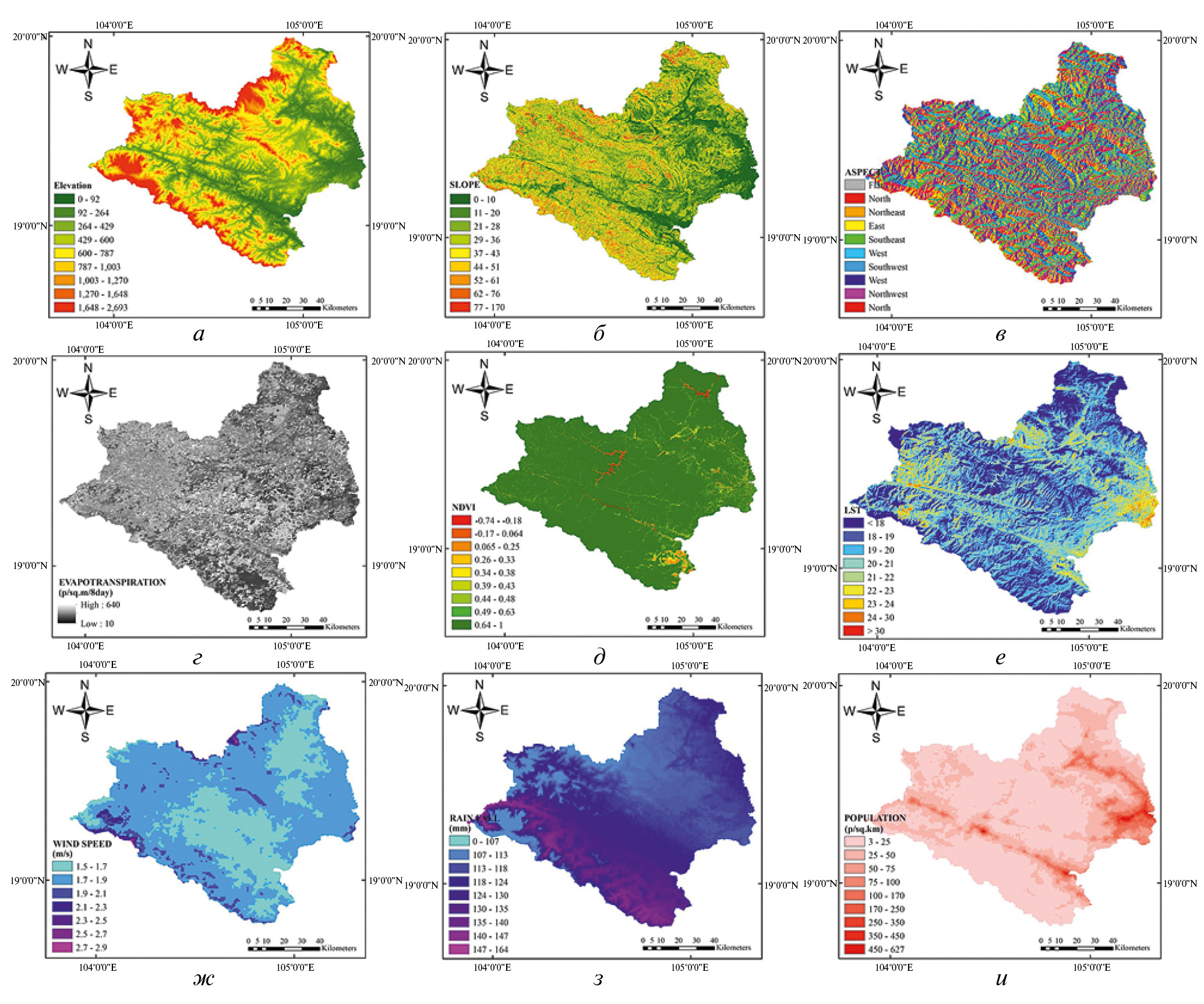 Рис. 5. Информационные слои – входные данные для моделей прогнозирования лесопожарной опасности: а – высота местности; б – наклон склона; в – экспозиция склона; г – поверхностная эвапотранспирация; д – вегетационный индекс NDVI; е – температура поверхности; ж – скорость ветра; з – среднемесячное количество осадков; и – плотность населения.