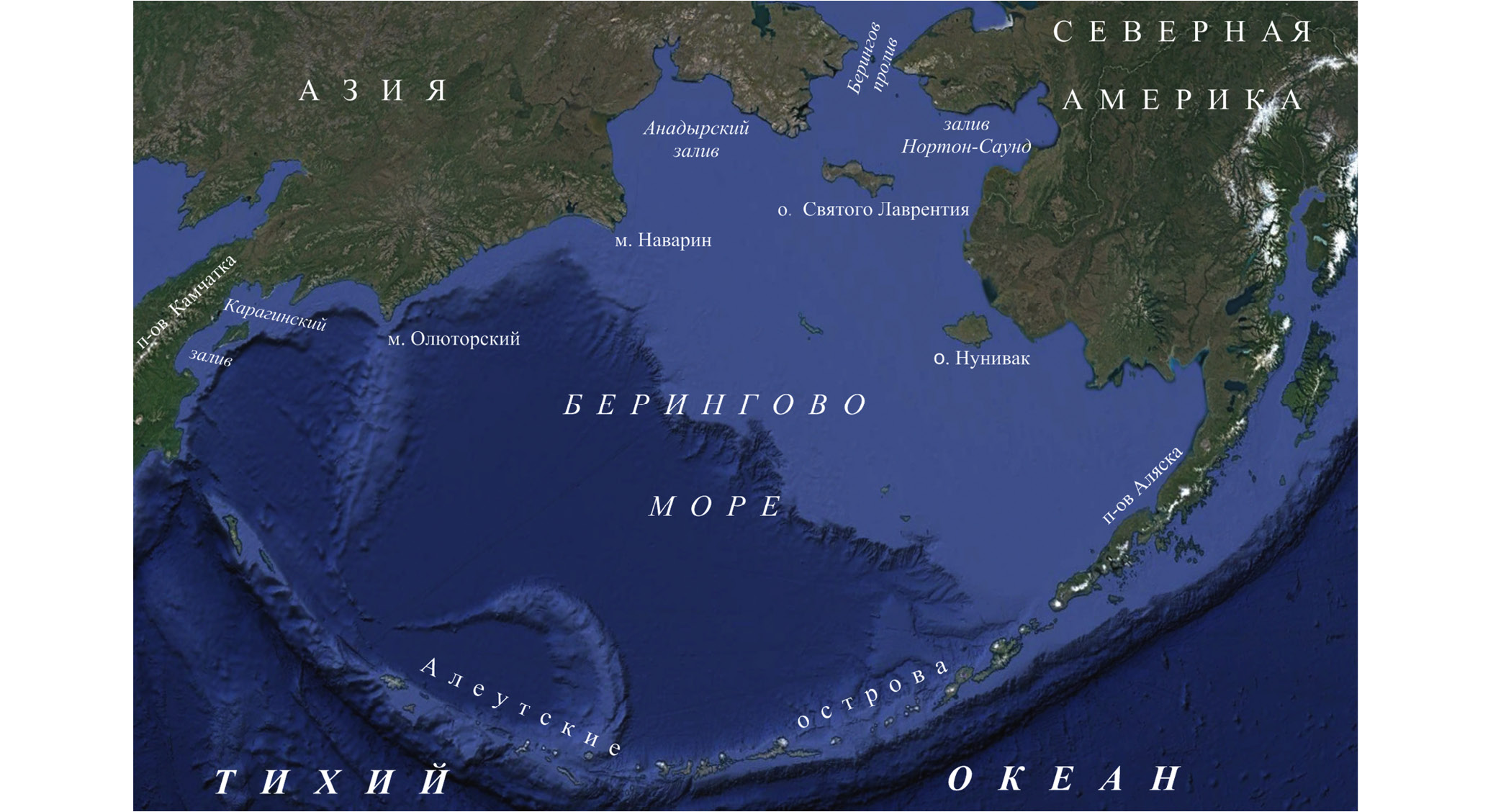 Исследование базировалось на данных реанализа ERA5 по температуре поверхности Берингова моря за 1998‒2020 гг., взятых с сайта https://cds.climate.copernicus.eu. Эти материалы основаны на широком спектре наблюдений за температурой воды в поверхностном слое океана, включая контактные судовые измерения, всплывающие буи ARGOS, дрифтеры и т. д. Однако главной основой данных ТПМ являлись спутниковые наблюдения за морской поверхностью, важным преимуществом которых являлся полный охват акватории Мирового океана, а также информация о состоянии атмосферы, используемая при моделировании процессов в системе океан–атмосфера. Пространственное разрешение данных составляло четверть градуса, временное – один месяц. Область исследования была ограничена координатами 51.5°–66° с. ш. и 161° в. д. – 157° з. д. и полностью включала акваторию изучаемого бассейна, а также два участка северо-западной и северо-восточной части Тихого океана, примыкающих к Алеутской островной гряде (рис. 1).
