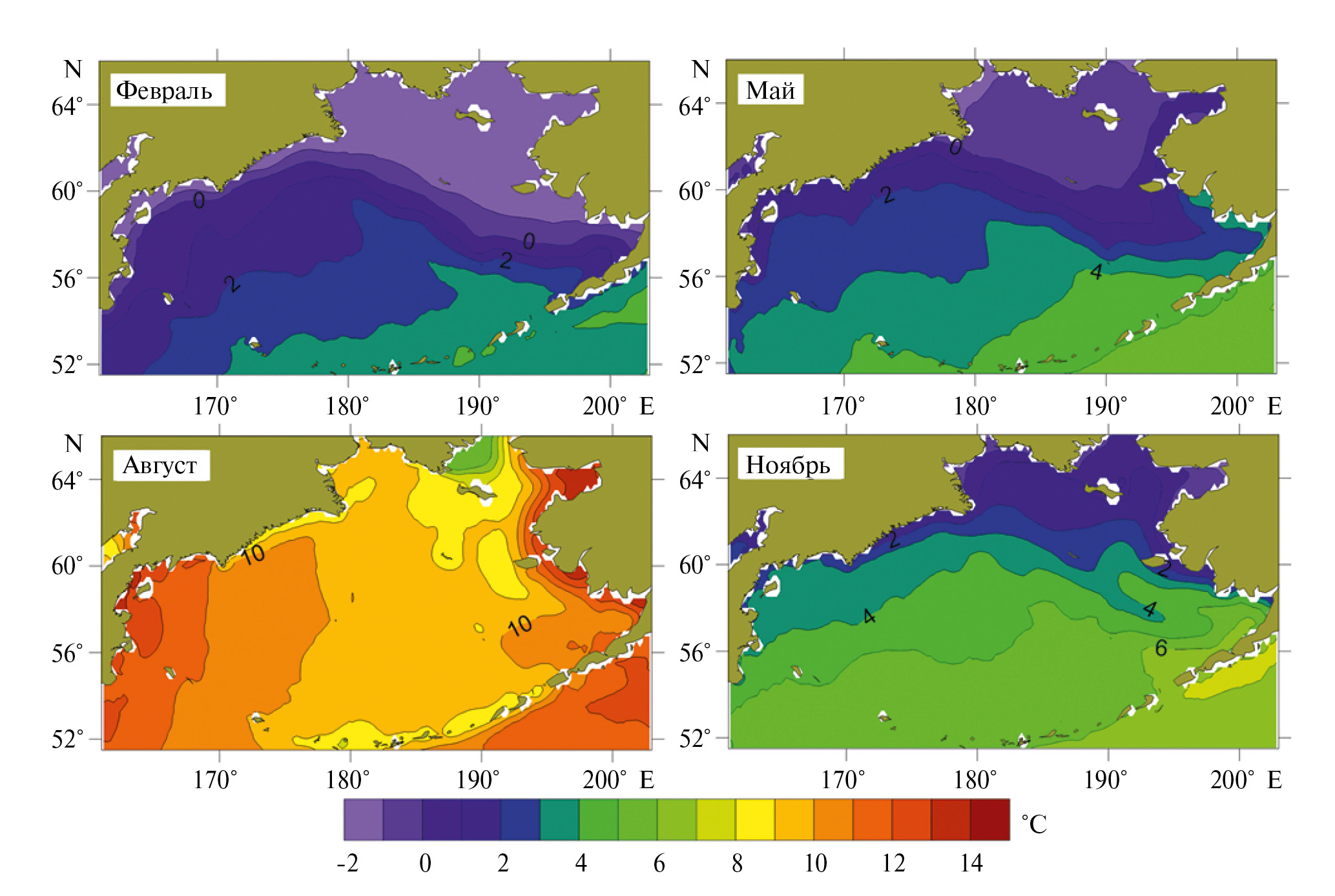 Подробное описание пространственных распределений температуры воды, построенных помесячно на основе судовых измерений, было приведено в работе (Гидрометеорология, 1999), что позволяет сравнить их с результатами, полученными по данным реанализа. В этой работе отмечалось две важных особенности гидрологического режима Берингова моря, проявляющихся в сезонных вариациях температуры поверхностного слоя воды. Первая из них связана с тем, что на его акватории выделяются два периода, различающихся крупномасштабными особенностями распределения ТПМ. На протяжении большей части года, в холодный период и весной (с ноября по июнь) главным отепляющим фактором является поступление более теплой океанской воды через проливы Алеутской островной гряды, поэтому наиболее высокие значения температуры отмечены в южной части моря. Летом же (июль‒сентябрь) наиболее важным является прогрев мелководных районов на северо-востоке и на западе, в Карагинском и Анадырском заливах, а вдоль островной гряды температура существенно ниже, чем на остальной части бассейна. Поле температуры в октябре является переходным.