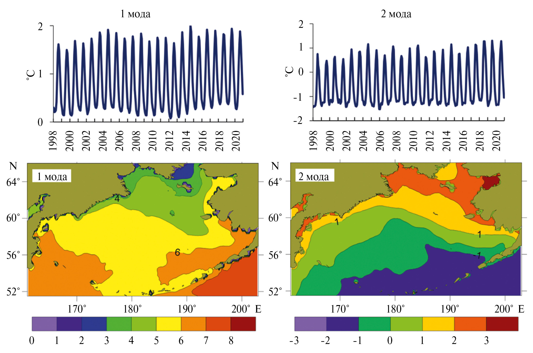 Вариации временной функции первой моды идентичны ходу усредненных значений ТПМ (коэффициент корреляции r = 0.999) и хорошо описываются комбинацией годовой и полугодовой гармоники с амплитудами 0.8° и 0.2°C соответственно. Все ее значения положительные, значимые величины более 1°C наблюдаются с июля по октябрь, максимальные значения августе и сентябре (1.78° и 1.66°C), минимальные – в феврале–апреле (около 0.25°C). Временной ход одинаков во всех пространственных ячейках изучаемой области, различия в интенсивности прогрева характеризуются пространственной функцией. Характер временной функции показывает, что первая мода отражает главным образом особенности ТПМ летом и при переходе к осени. К ним относятся прежде всего отсутствие гидрологического фронта, высокие значения температуры в центральной, юго-восточной и юго-западной частях моря, а также относительно низкие значения параметра в центральной части Алеутской гряды. Небольшие значения пространственной функции в северо-западной части бассейна, у побережья Чукотки и в Анадырском заливе отражают поступление холодной воды из Северного Ледовитого океана и осенний ветровой апвеллинг.