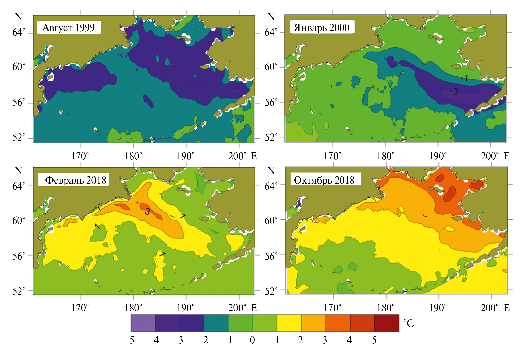 Случай положительных аномалий в холодный период года имел место в феврале 2018 г. На всей акватории моря они превышали 0.4°C, вблизи побережья России – 1.2°C, а в полосе от м. Наварин в направлении восточного сектора Алеутских островов – 3°C. Последнее значение также очень велико для зимних условий, в этой полосе аномалия превышала 3σ (на площади около 8 % от всей изучаемой акватории). Неслучайно зимние условия этого года характеризовались низкими значениями ледовитости ‒ ледяной покров сформировался на существенно меньшей площади, чем обычно (Басюк, Зуенко, 2019).