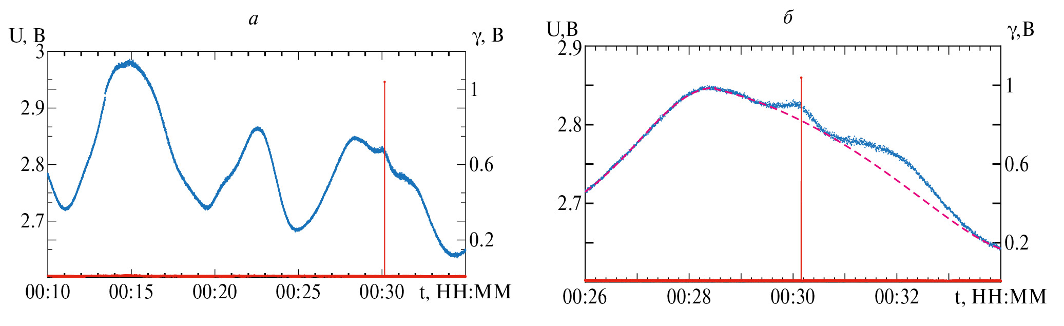 Рис. 2. а – запись интенсивности микроволнового излучения и импульса гамма-излучения (в единицах напряжения на выходе приборов) в ночь с 3 на 4 августа 2022 в г. Чита, б – график для выделенного участка с мощным гамма-излучением (γ).